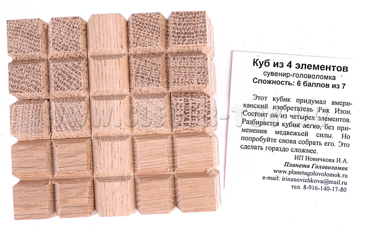 "Кубик из 4 элементов" представляет собой уникальную головоломку, которая состоит всего из четырех элементов. Хотя разборка кубика довольно проста, собрать его обратно - настоящее испытание, требующее острого ума и настойчивости.
