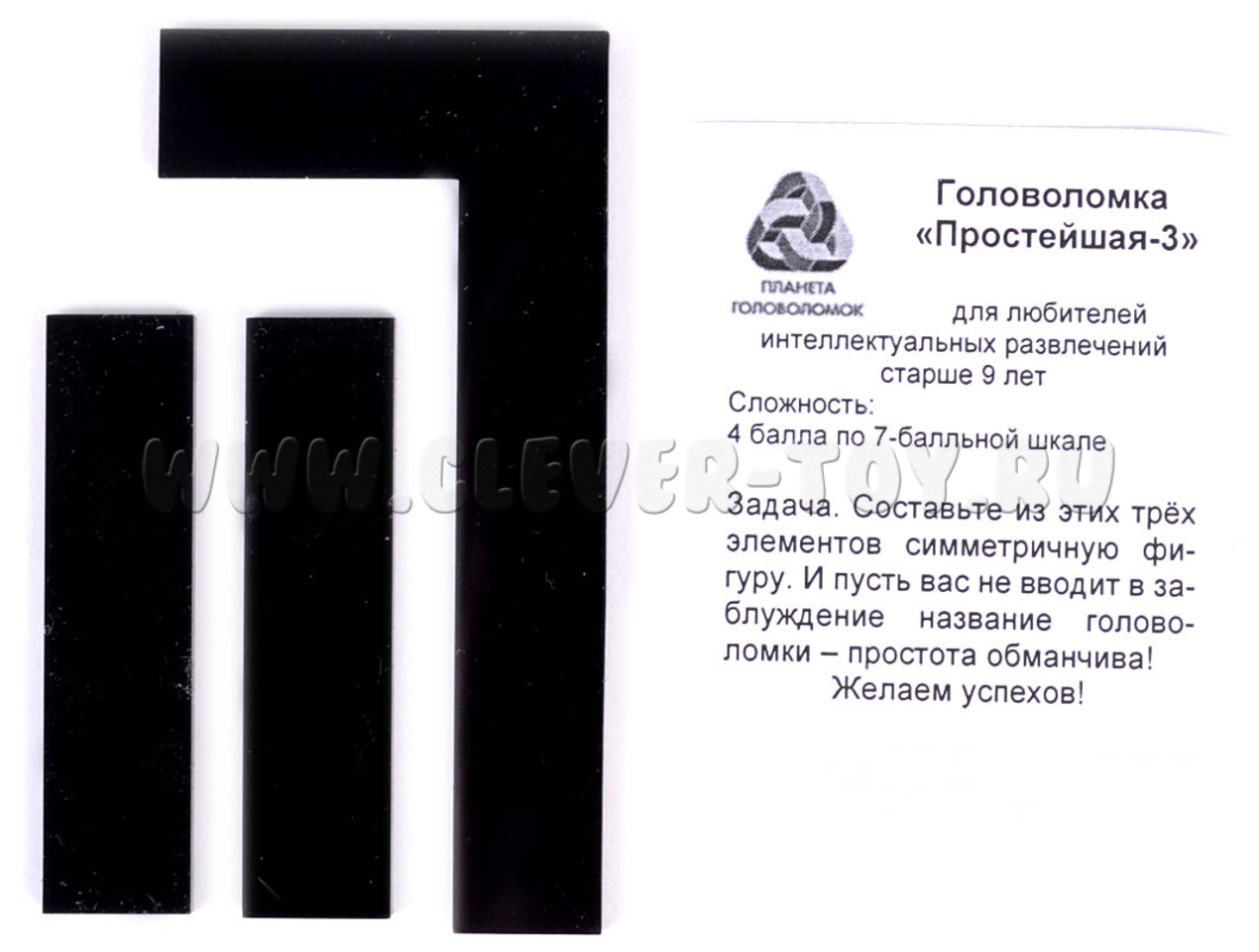 Головоломка “Простейшая - 3”. Всего три детали, одно решение. Думаете просто? Испытайте сами! Вам надо составить из всех деталей симметричную фигуру. Однако размеры деталей неудобны для создания симметрии. Собственно, в этом и сложность.