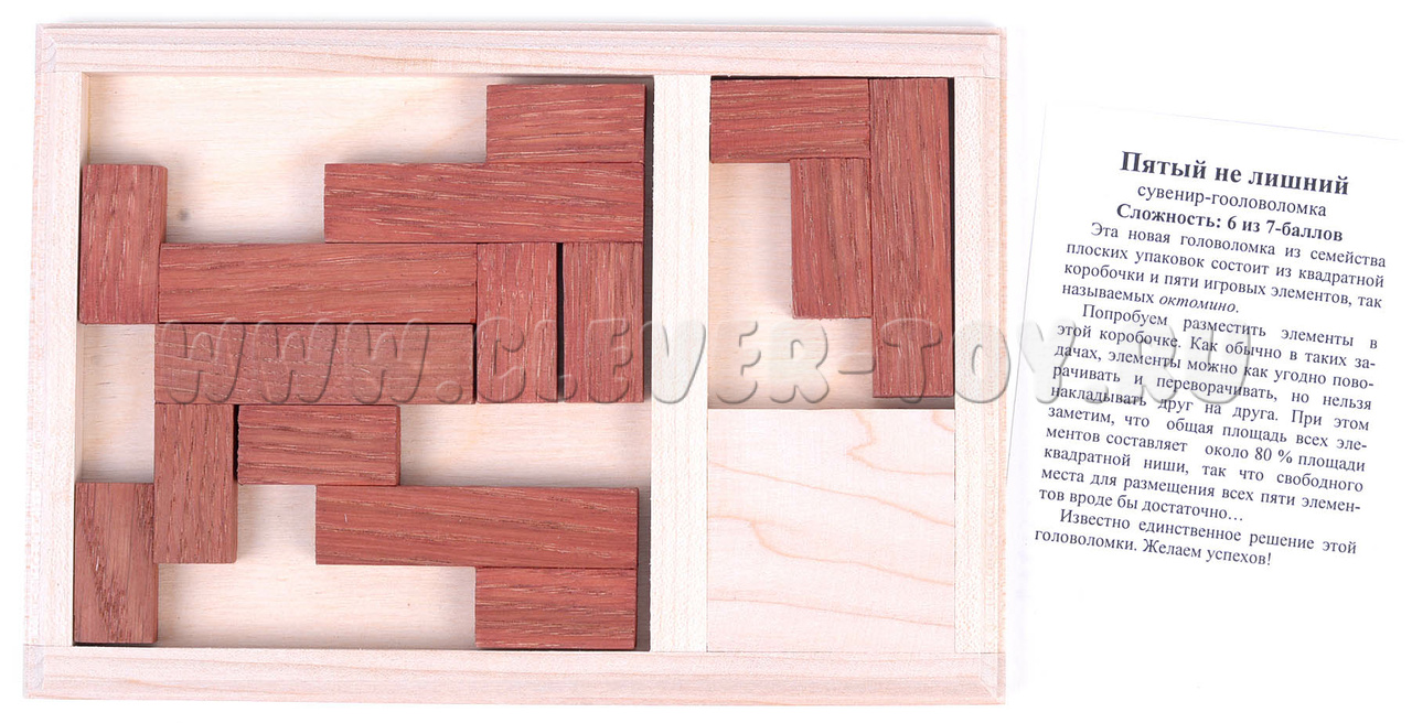 Головоломка “Пятый не лишний” – название сразу объясняет правила игры. У вас есть 4 деревянных детали в большой рамке и одна в маленькой. Ваша задача – уложить все элементы в большой рамке.