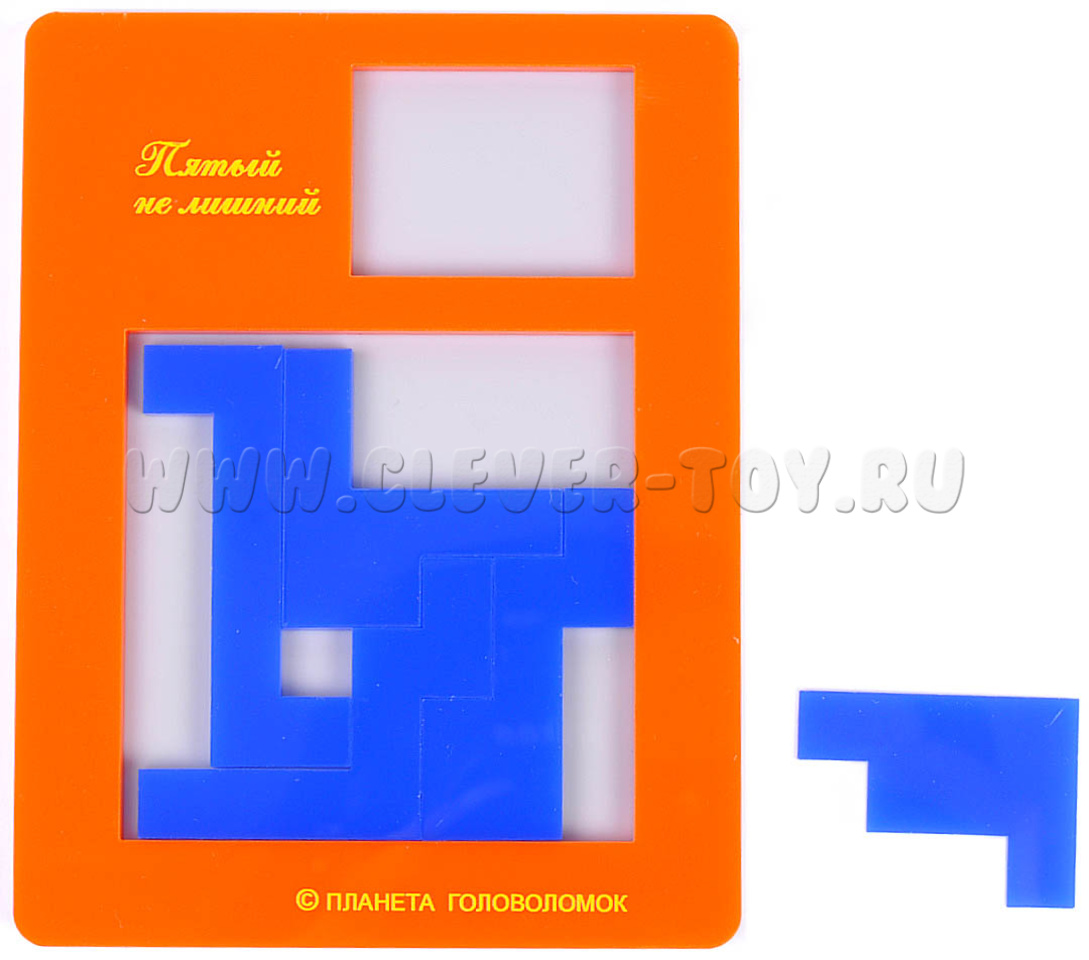 Нужно разместить все элементы в коробочке. Как обычно в таких задачах, элементы можно как угодно поворачивать и переворачивать, но нельзя накладывать друг на друга. При этом общая площадь всех элементов составляет около 80% площади квадратной ниши, так что свободного места для размещения всех пяти элементов достаточно. Однако, задача не так проста. Известно единственное решение этой головоломки.