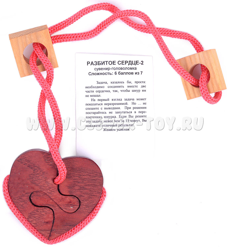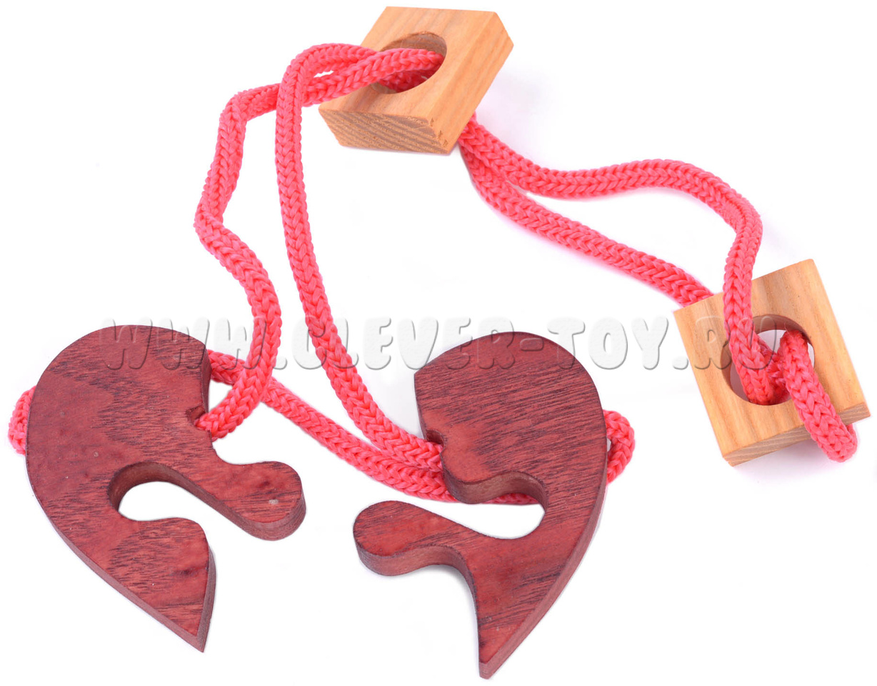 Головоломка "Разбитое сердце 2" представляет собой две деревянных детали сердца и две детали для дополнительного усложнения. Цель задачи - соединить две части сердечка таким образом, чтобы они образовывали единое целое, а шнурок им не мешал.