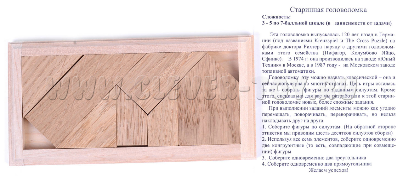 Старинная головоломка – задачка для тех, кто хочет улучшить свое абстрактное мышление или, наоборот, проверить его. В этой головоломке вам необходимо составить определенные силуэты по образцу из выделенных вам деталей.