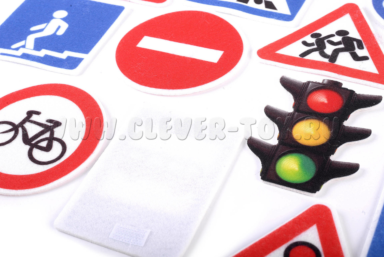 • Основные и самые распространённые дорожные знаки – 16 игровых элементов, среди которых изображения светофора, знаки «Место остановки автобуса», «Пешеходный переход», «Въезд запрещён», «Велосипедная дорожка», «Дорожные работы», «Внимание, дети!» и др.;