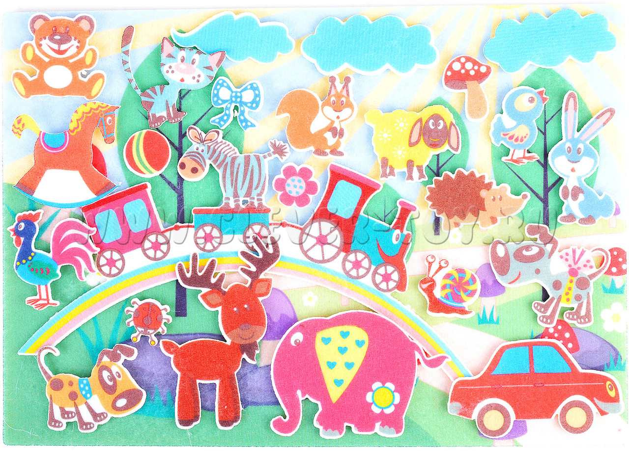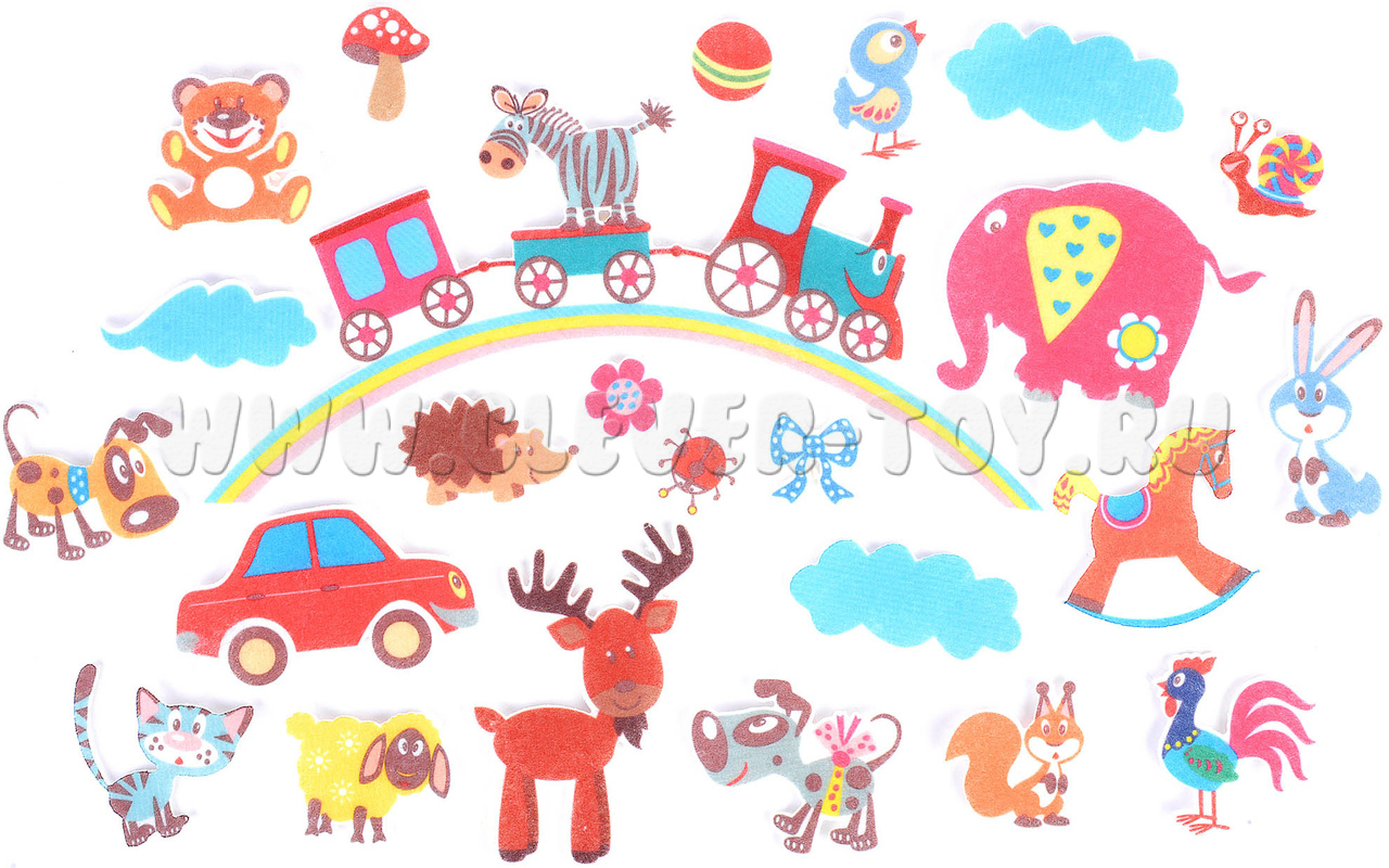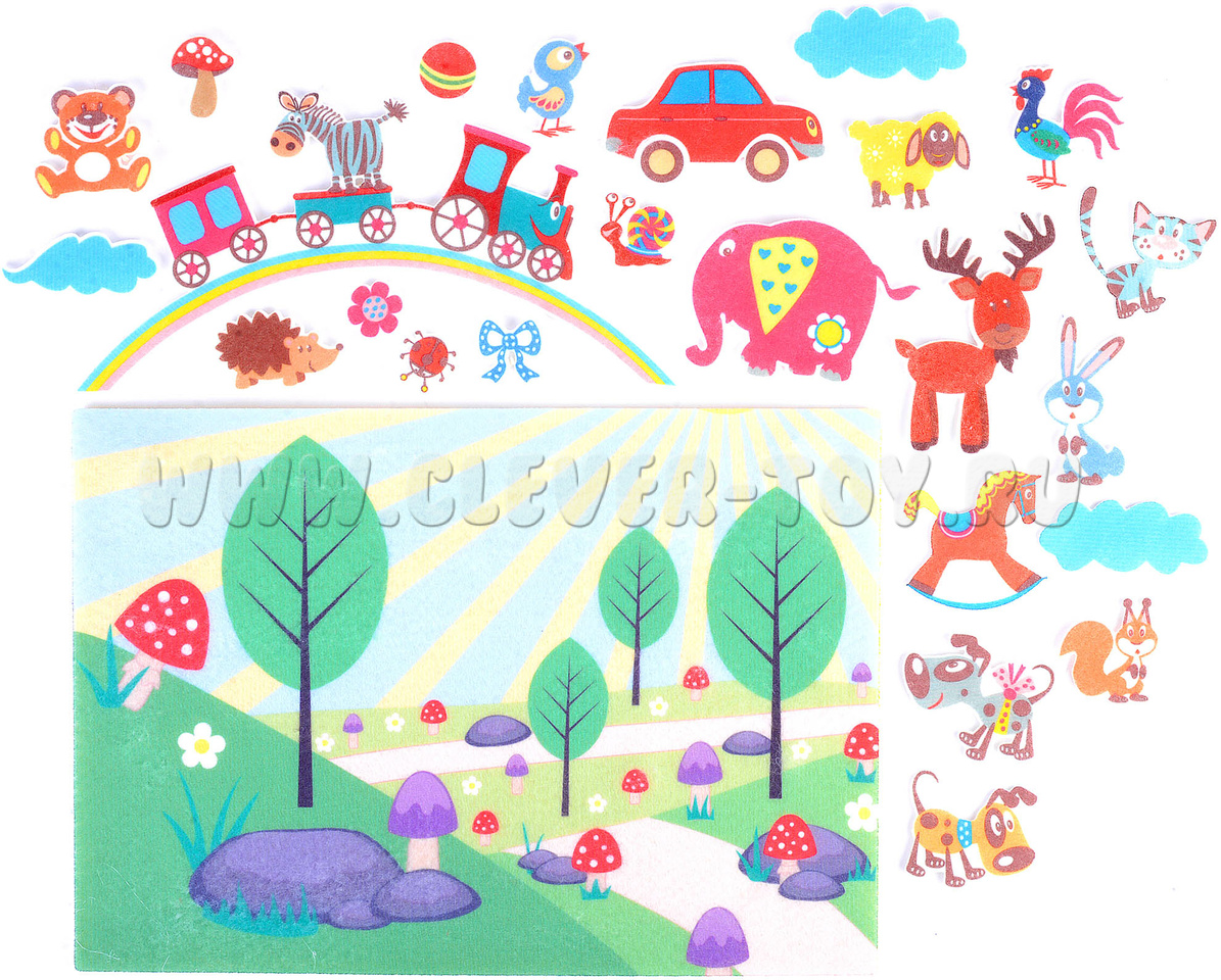 • грибок, тучки, цветочек, бантик, радуга с паровозиками, куда можно посадить зверей;