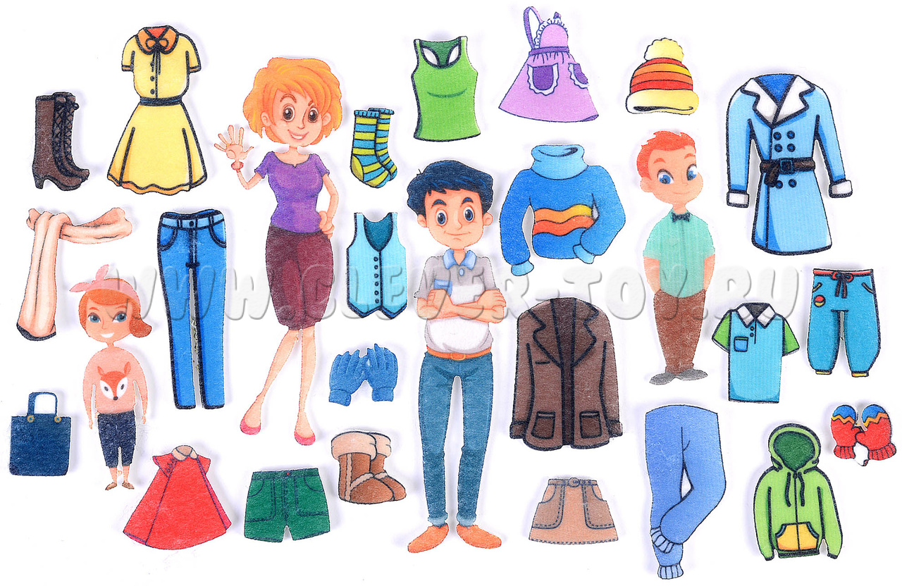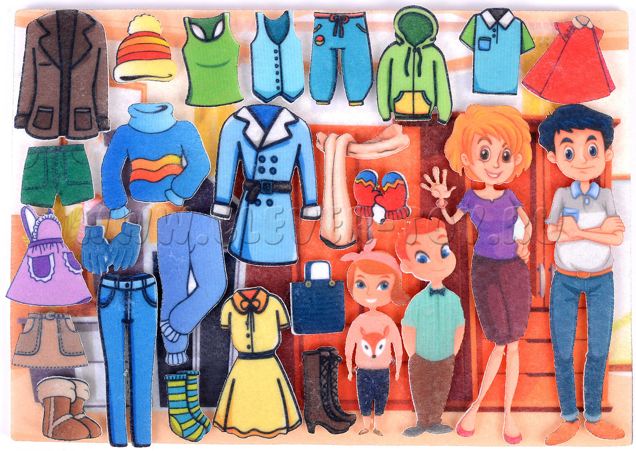 В чем папа пойдет на работу? Как не испачкаться на кухне? В какое время года надеть шапку и варежки? На этот и другие вопросы малыш отыщет ответы, наряжая веселую семью в пальто и платьица. Можно даже придумать историю о приключениях домочадцев и разыграть ее по ролям.