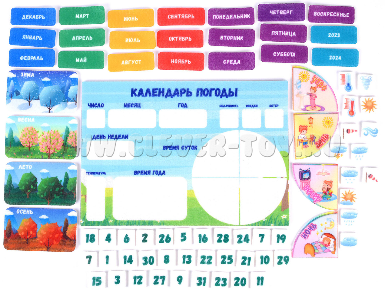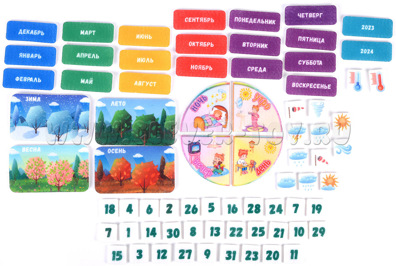 • Таблички, обозначающие времена года (4 шт.), годы (4 шт.), месяца (12 шт.), дни недели (7 шт.), числа (31 шт.), погоду (11 шт.), температуру (2 шт.), время суток (4 шт.).