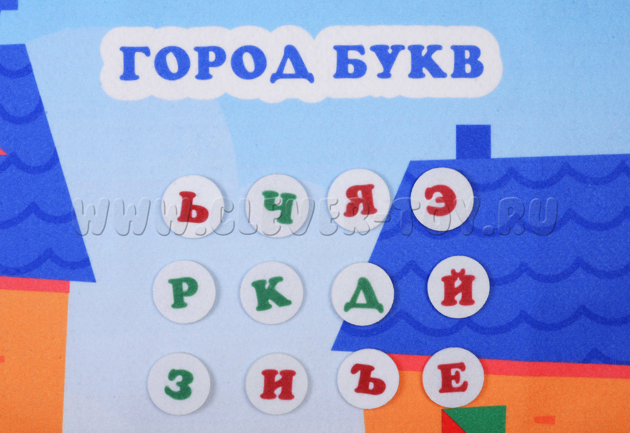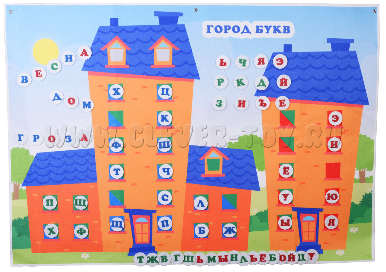 Фетровое панно «Город с буквами» от компании «LIP-LIP» - отлично подходит для наглядного изучения букв и чтению по складам (комбинации из двух букв) и слогам. Благодаря многоразовым липучкам игровые элементы легко крепятся к панно.