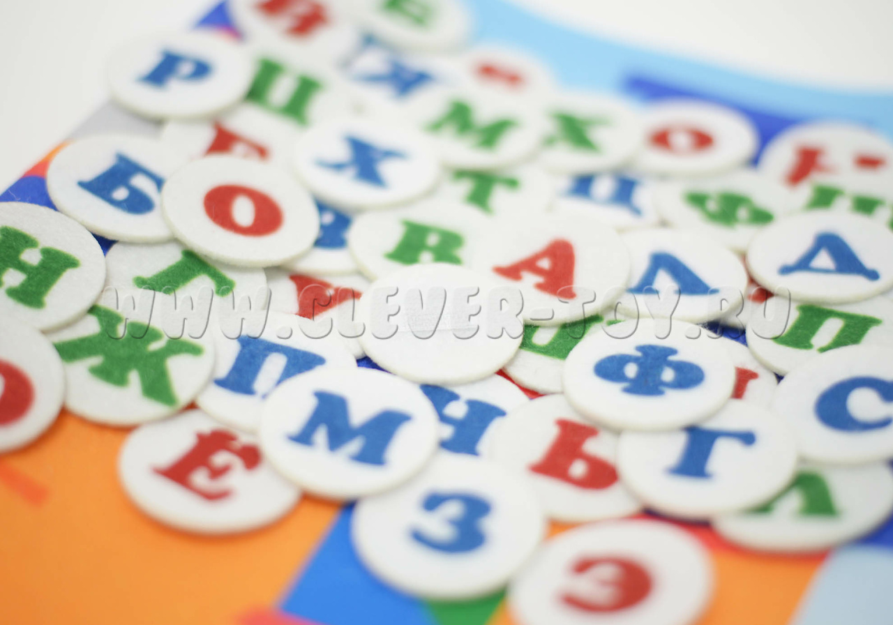 • Игровые элементы в форме кружочков (3,5 см) с буквами красного и синего цвета (всего 66 шт.)
