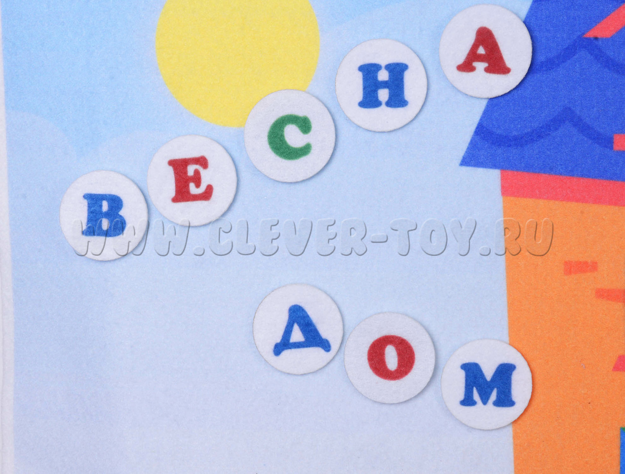 • Красочное панно (70 х 98 см) с изображением четырёх домиков в городе букв. Для удобства, на игровом поле имеются специальные люверсы, позволяющие легко повесить его на стену.