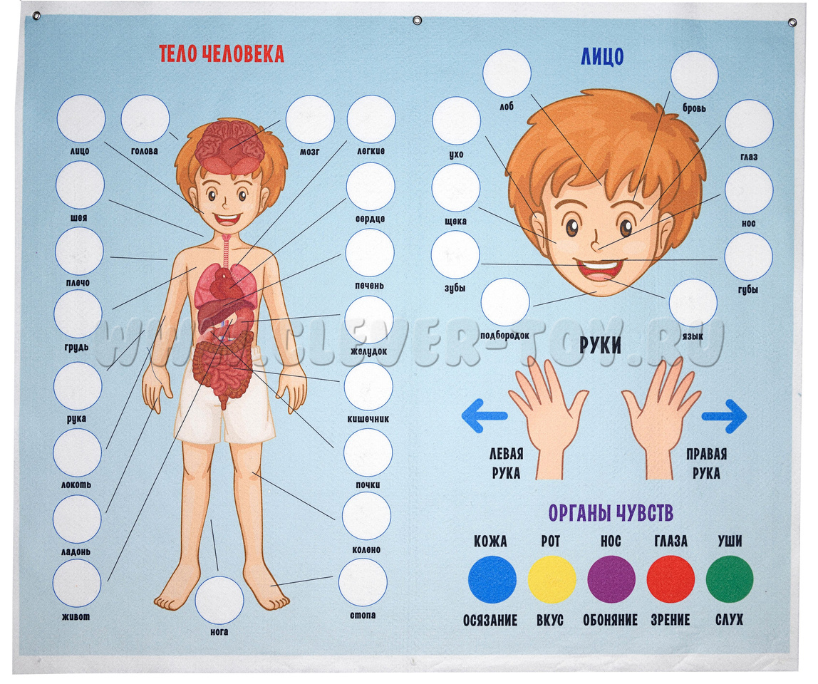 В комплект игры входит игровое поле размером 80×60 см, на котором изображена фигура мальчика с линиями-указателями. На эти линии нужно крепить картинки с частями тела. Также в наборе есть изображения ладоней с подписью «Право-Лево» и органов чувств с подписями, но без картинок. Детям предлагается дополнить их соответствующими картинками или цветными кружками.