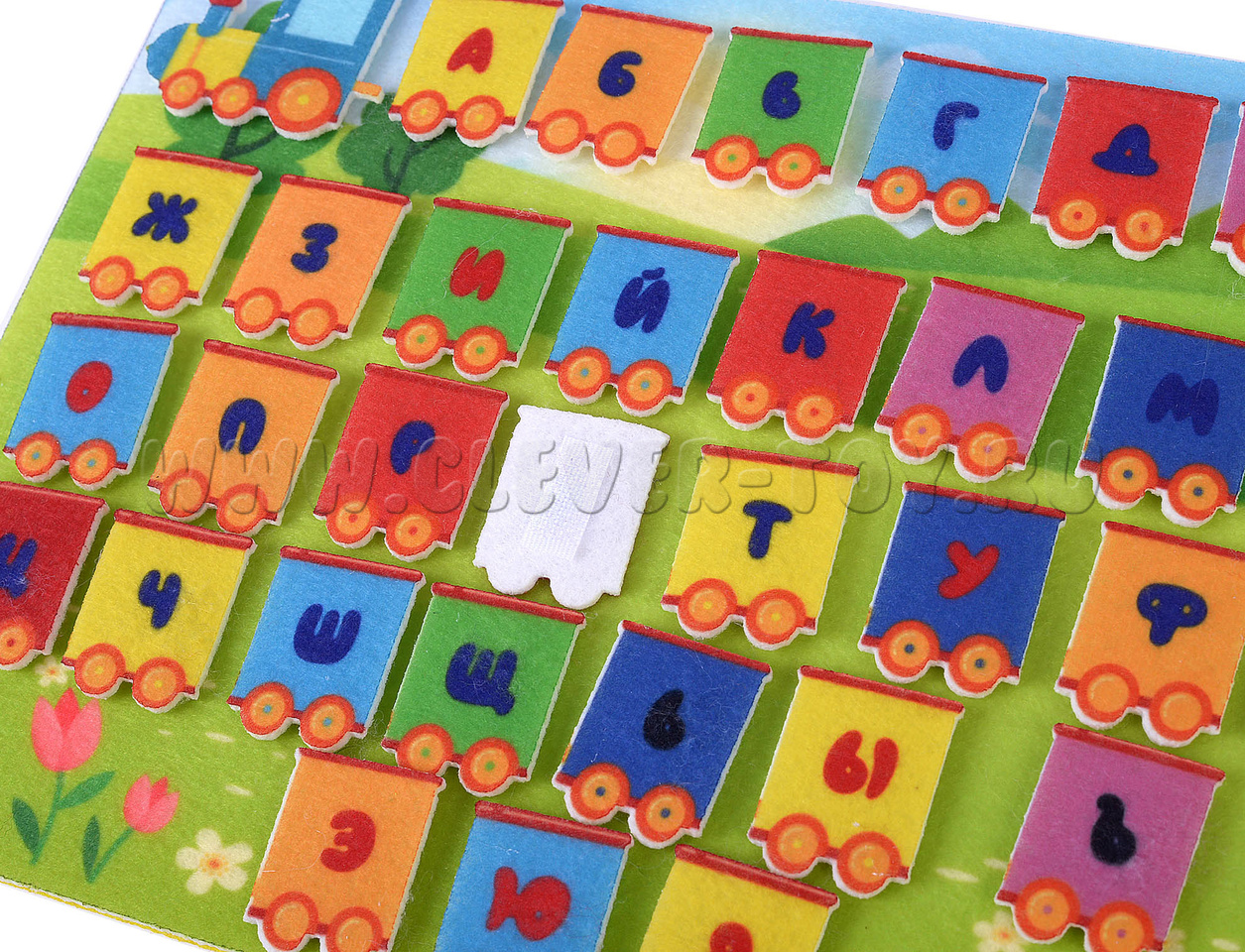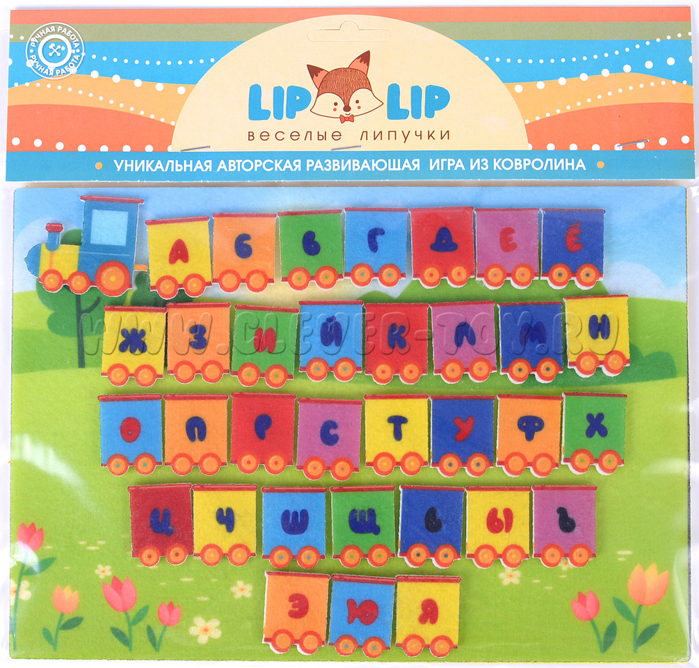 Сзади у каждой фигурки есть липучка, с помощью которой можно прикрепить вагончик на поле. Материал игры - безопасный фетр.