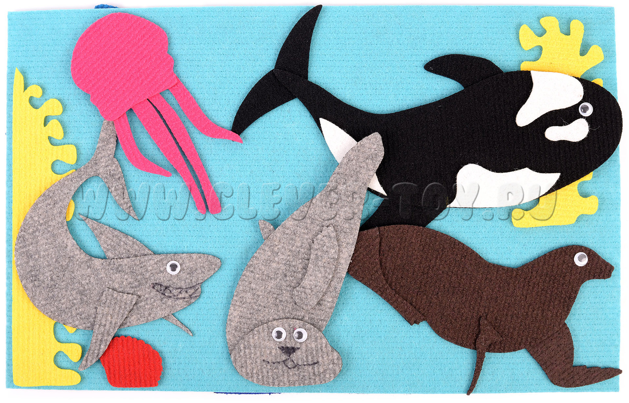 - обитатели моря: осьминог, касатка, морской котик, тюлень, кит, акула, скат, медуза, морской конёк, дельфин, мурена, морская звезда, рыбка;