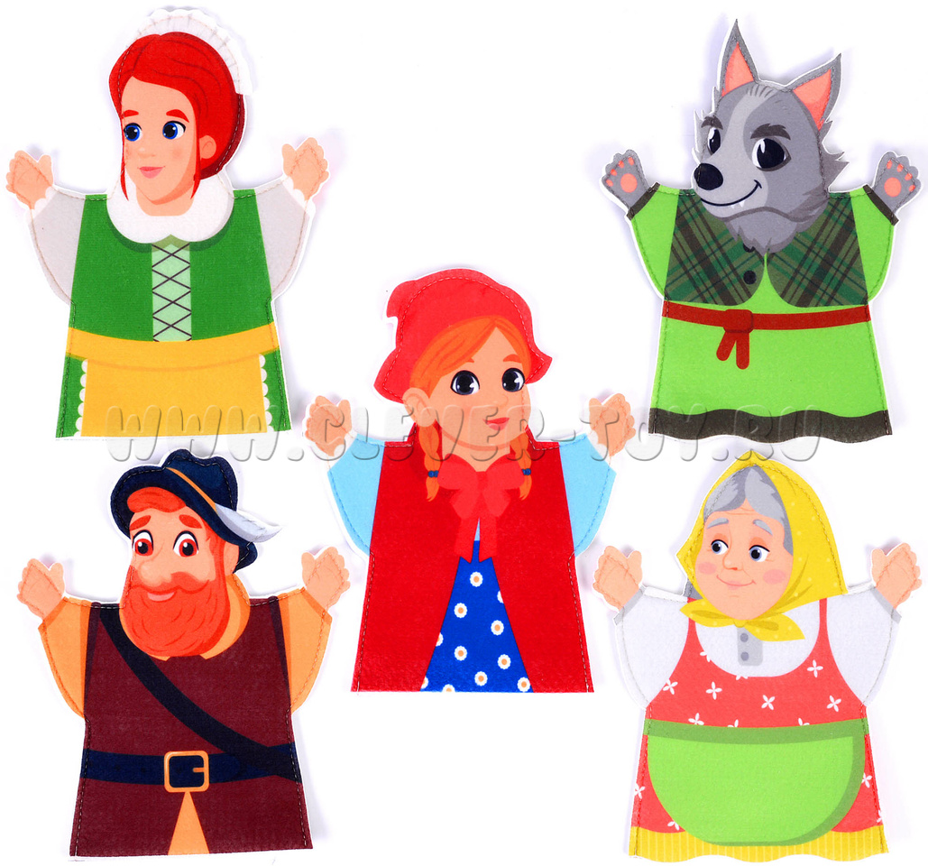 В составе набора 5 фигурок: Красная шапочка, волк, мама, бабушка, охотник. Средний размер фигурок 195*235 мм.