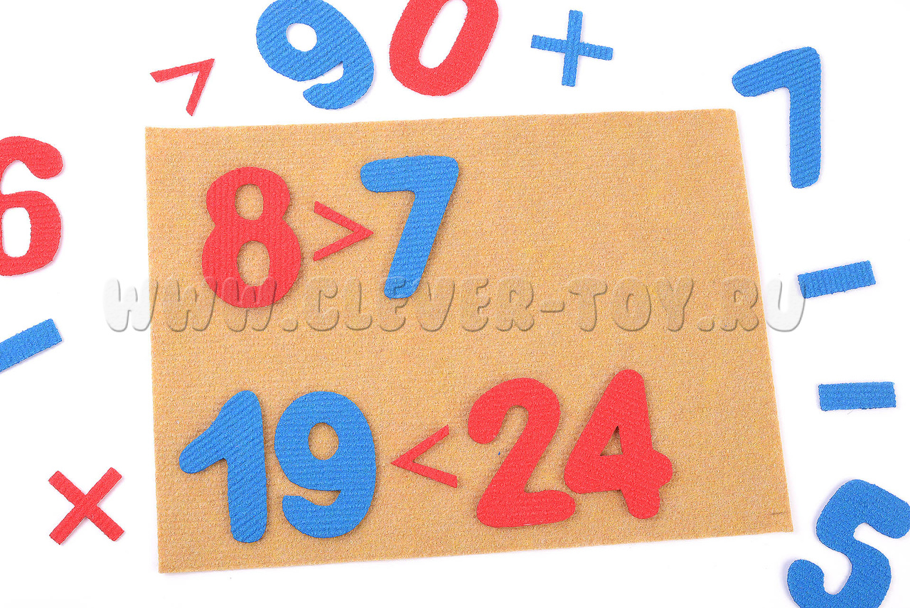 - математические знаки – 14 штук – плюсы, минусы, знак равенства, знаки «больше», «меньше»,