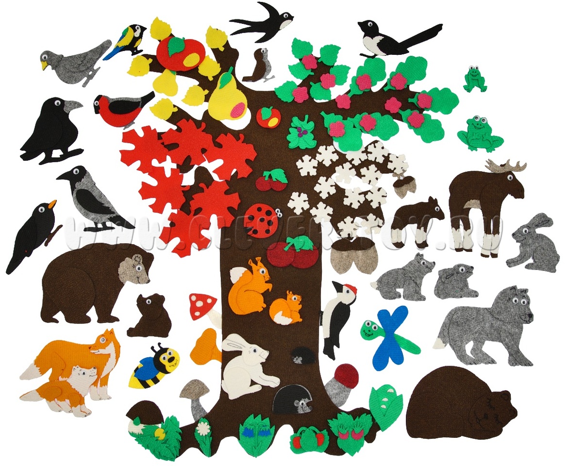 • элементы окружающего мира - большое дерево, солнце, облако, снежинки, цветочки, листья;