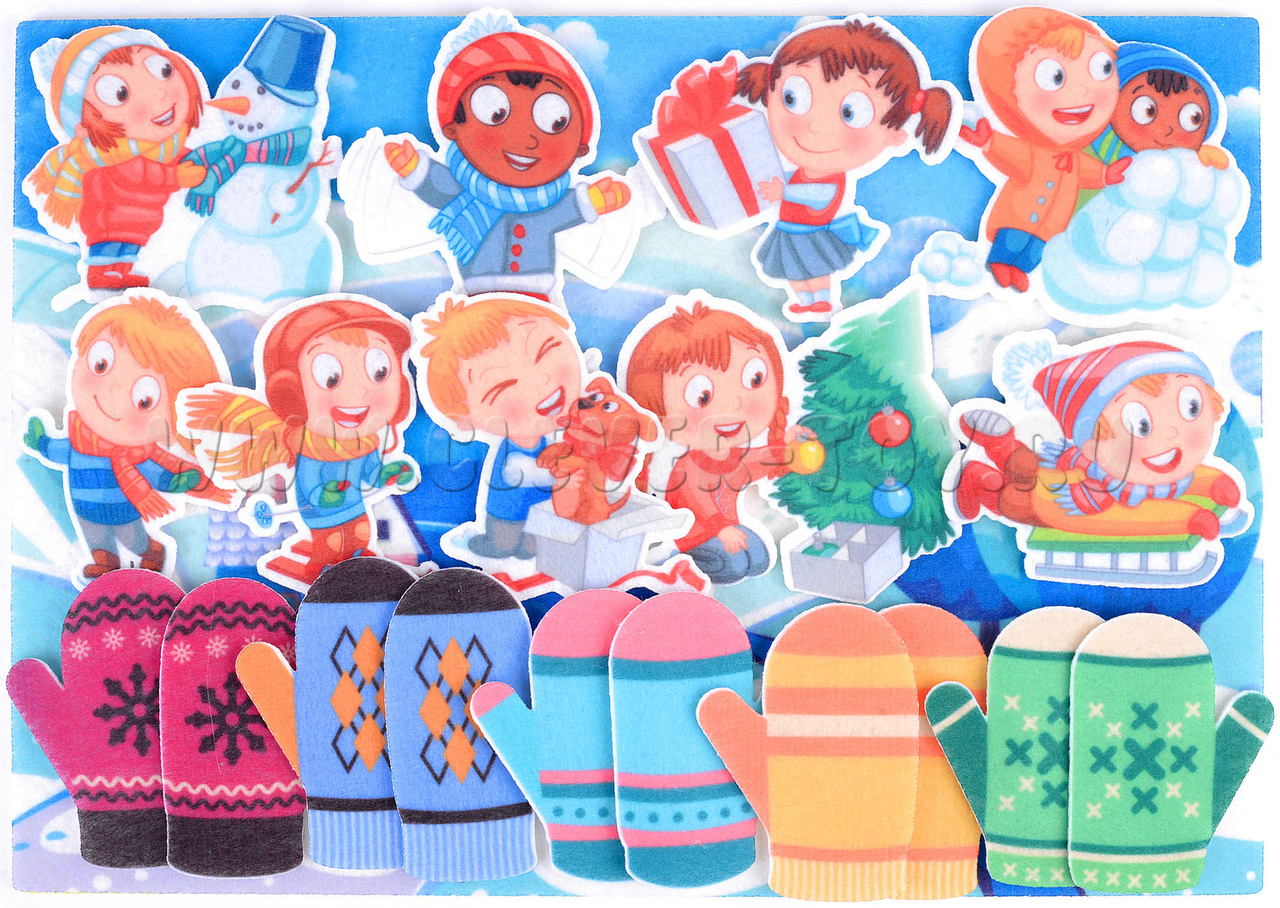 • Фигурки детей, иллюстрирующих зимние занятия: девочка со снеговиком, мальчишки, играющие в снежки, паренек, валяющийся в снегу, мальчишка, мчащийся на санках, паренек на лыжах, мальчик, радующийся подаренному щенку, девчонка с подарком, девчушка, катающаяся на коньках, и девочка, наряжающая елку (9 шт.);