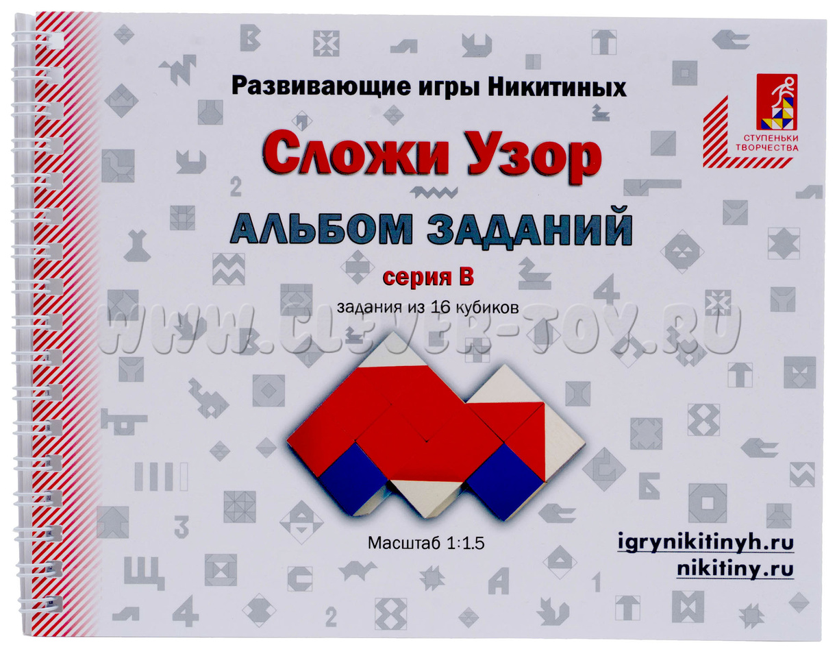 Сам альбом на пружине из плотной мелованной бумаги формата А5, впечатление производит приятное. Задания нарисованы в натуральную величину кубиков, это удобно для занятий. Одно большое НО: почти все картинки с заданиями повторяют представленные в буклете, который идет в комплекте с самими кубиками Никитина. Так что если у вас та книжечка не потеряна, не тратьте деньги, занимайтесь по ней.