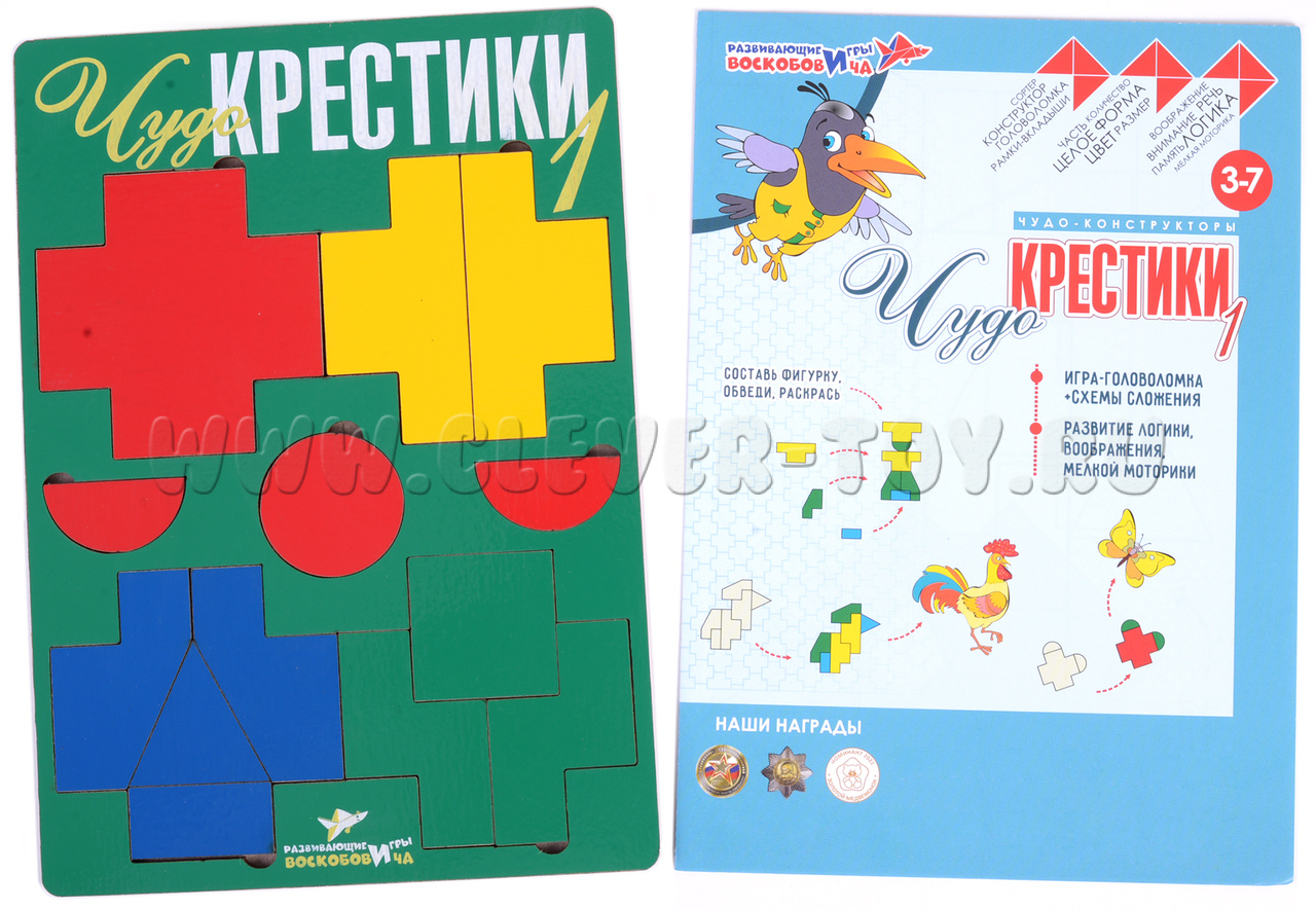 Плоскостной конструктор для раннего развития детей от фирмы «Развивающие игры Воскобовича». «Чудо-крестики» легко превращаются в различные фигуры и оригинальные предметные силуэты: человечки, предметы одежды, самолёты, растения, домики, зверей и т.д. В «Чудо-крестиках» заложены бесконечные возможности для творчества.