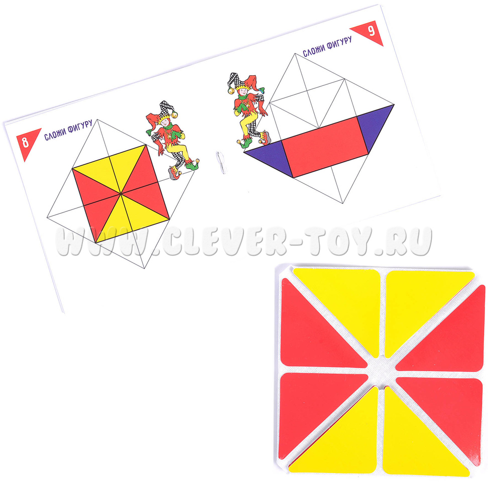 • квадрат, состоящий из разноцветных треугольников (жёлтый, красный, зелёный, синий), закрепленных на тканевой основе, что позволяет легко превращать квадрат в любую фигуру;