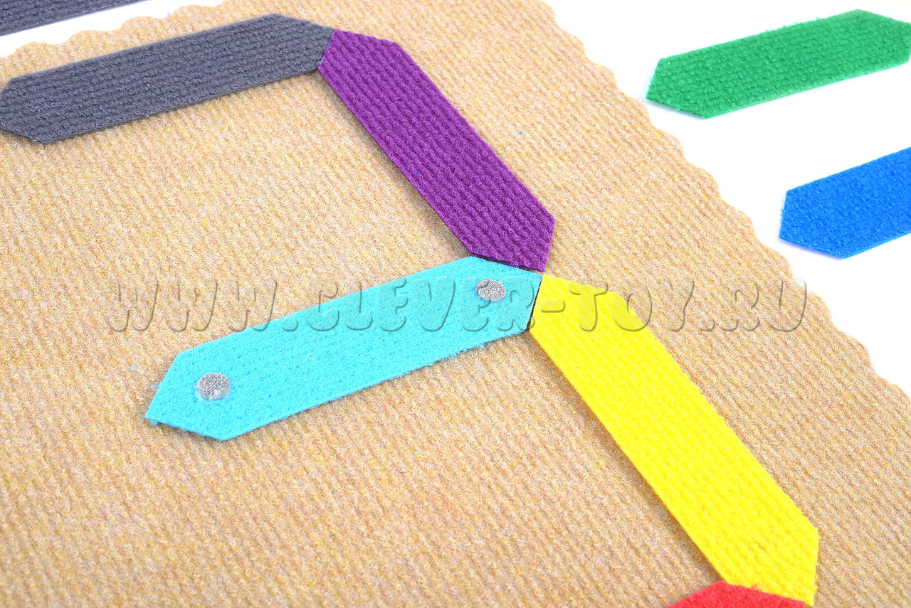 - три набора по 10 разноцветных односторонних палочек (радужные цвета + белый, серый, чёрный), палочки отличаются по величине (маленькие – 10 см., средние 14 см., большие 20 см.);