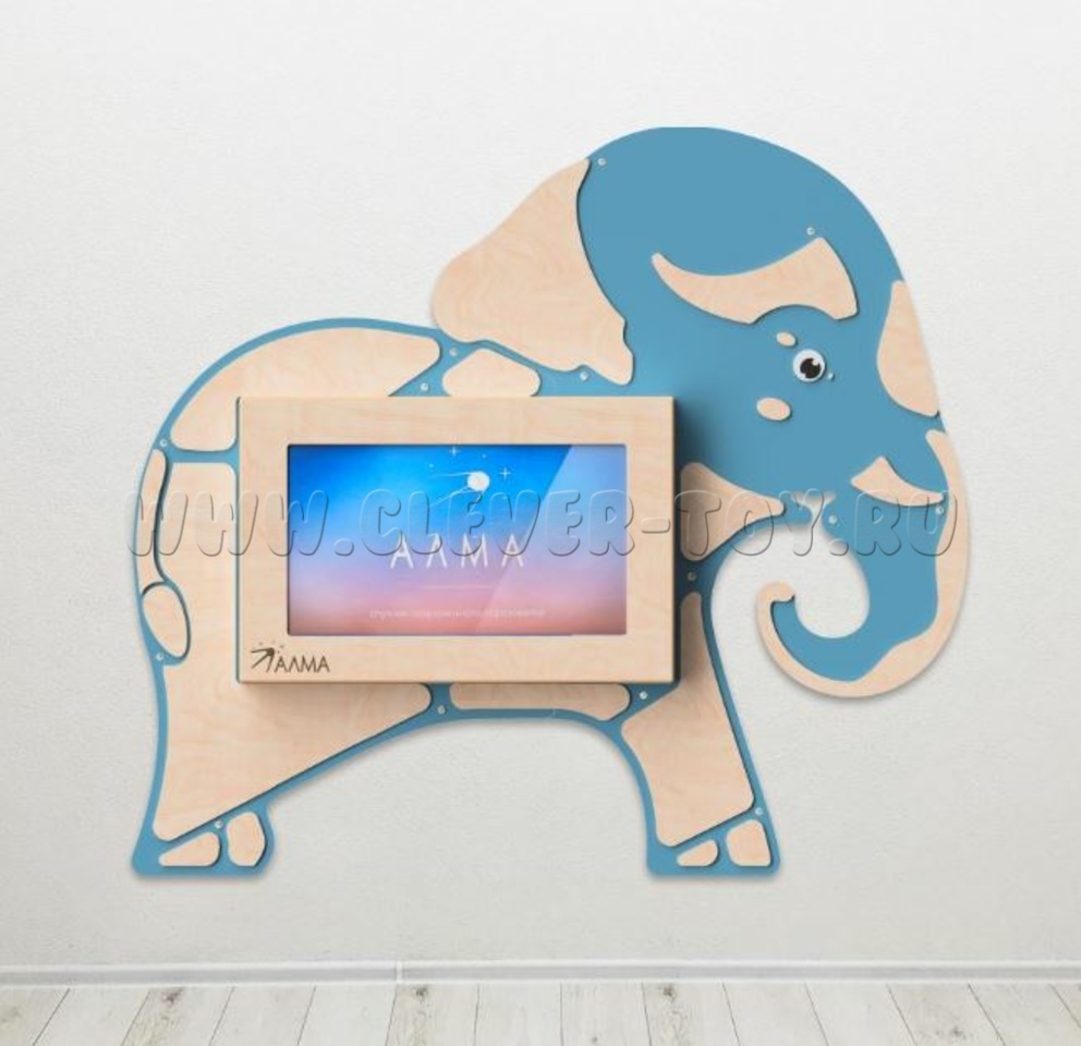 Настенная панель "Слон" со встроенной интерактивной сенсорной панелью 32 дюйма. Это одновременно декоративное оформление стен и развивающая игрушка, ведь на панели установлен пакет игрового и обучающего ПО от АЛМА.