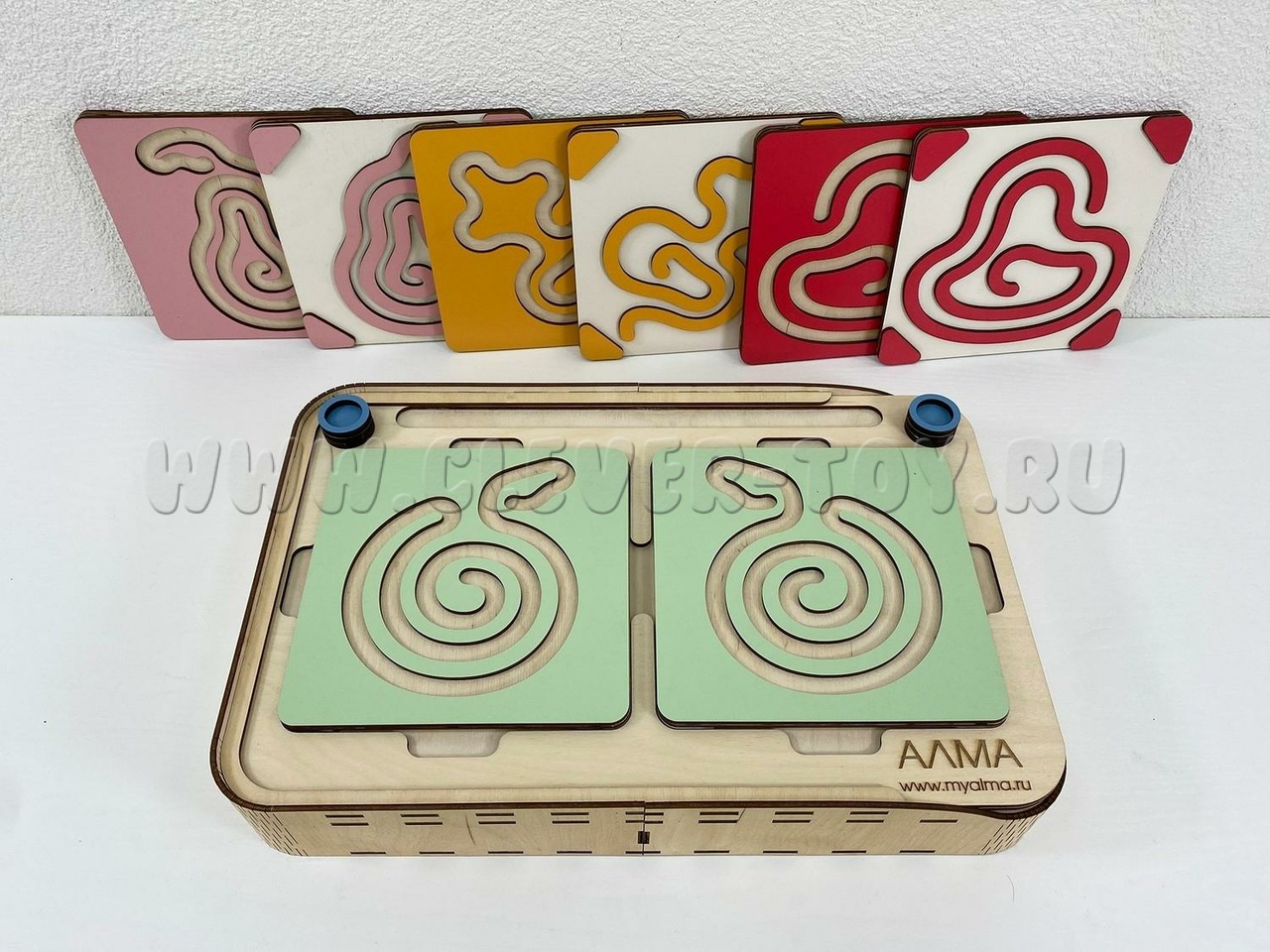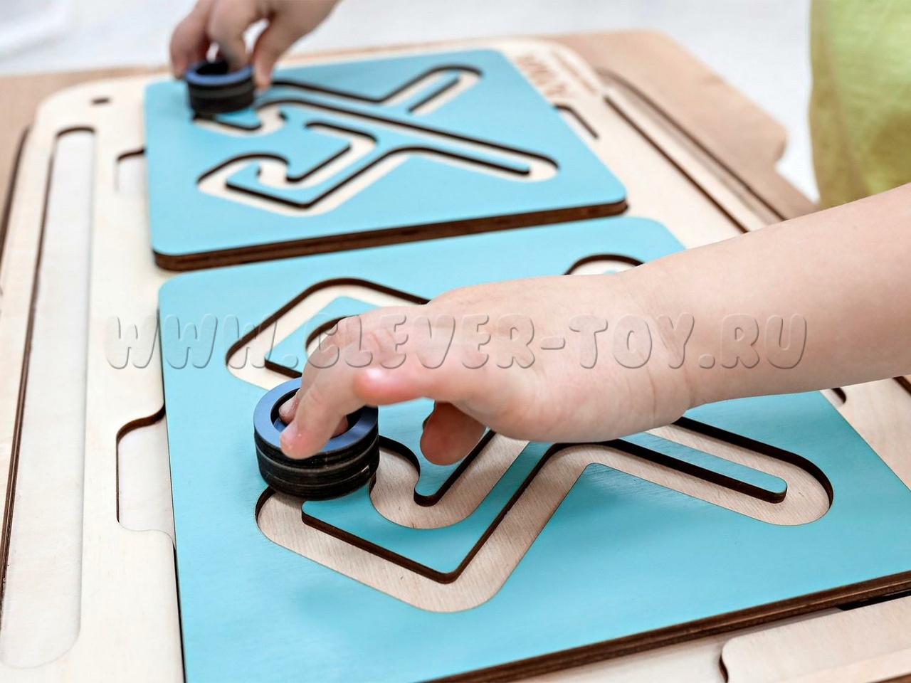 Два лабиринта с изображениями, расположенными симметрично, вставляются в пазы, и ребёнок проходит их с помощью специальных пальчиковых фишек.
