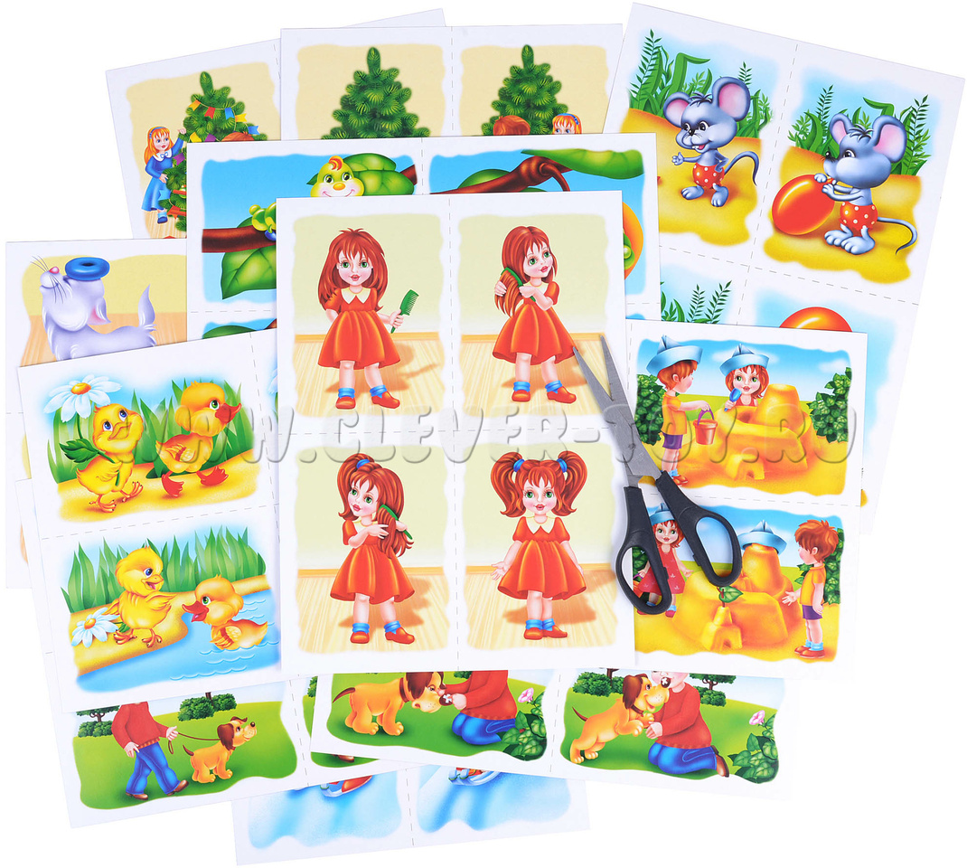 - сочинение историй с участниками картинок, во время которого малыш узнает и запоминает новые категории (названия домашних животных, времен года, мест и т.д.) и признаки, им характерные, расширяет представления об окружающем мире и учится использовать имеющиеся и новые знания в процессе мышления;