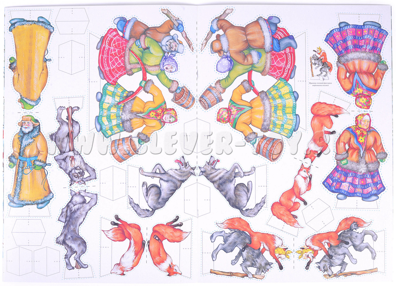 • Действующих персонажей выполненых из плотного картона, созданных для показа настольного театра. Средний размер персонажей, составляет 12 см. (Задача ребенка состоит в том, что нужно вырезать по пунктирным линиям 4 персонажа, лошадь и склеить их);