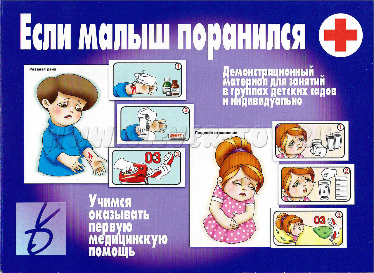 Демонстрационный материал "Если малыш поранился" адресован родителям, педагогам ДОО и воспитателям дошкольных учреждений и подойдет для организации занятий по основам техники безопасности и первой медицинской помощи среди детей старше 3-х лет. Занятия с демонстрационными материалами помогут малышам в: