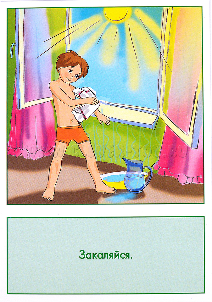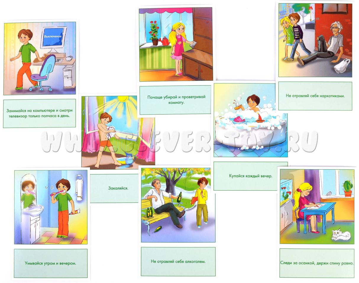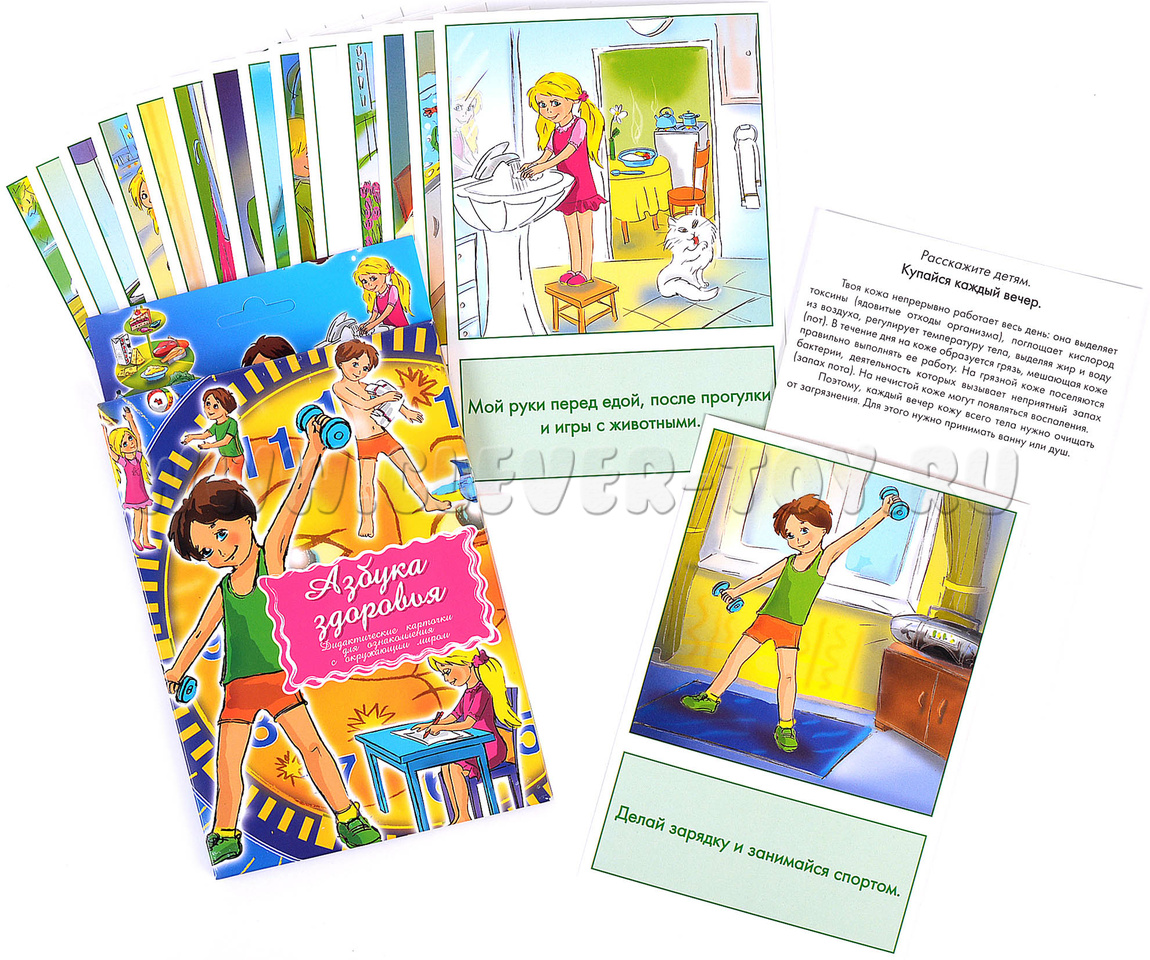 Наглядные карточки с детально прорисованными, яркими картинками познакомят ребёнка с основными правилами ЗОЖ: