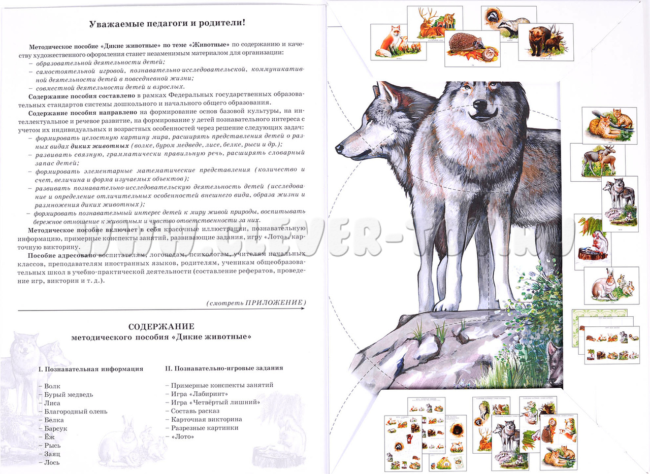 - 10 натуралистичных изображений диких животных (Ёж, бурый медведь, лось, волк, заяц, белка, олень, лиса, рысь, барсук), на обратной стороне - их описание, ареал обитания, особенности поведения, питания, образа жизни;