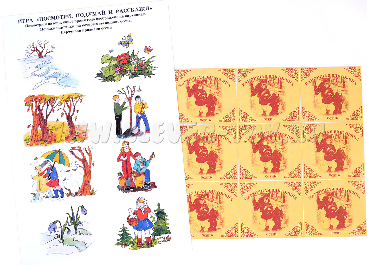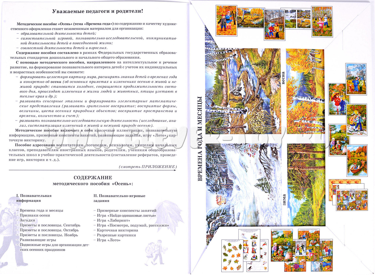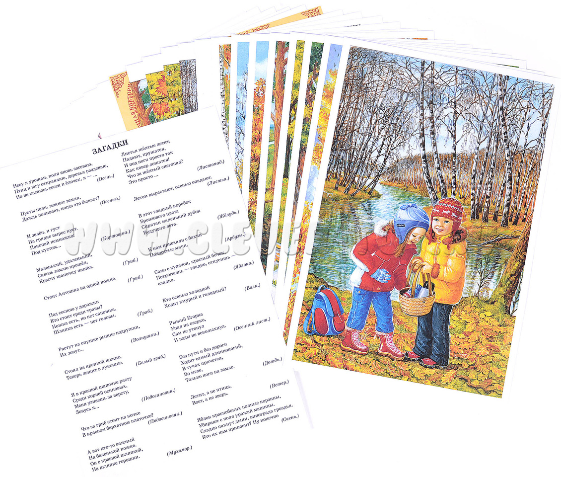 • 10 красочных изображений, иллюстрирующих изменение погоды, явления природы, виды деятельности, на обороте - список признаков осени, пословицы и приметы, загадки, планы развивающих и подвижных игр;