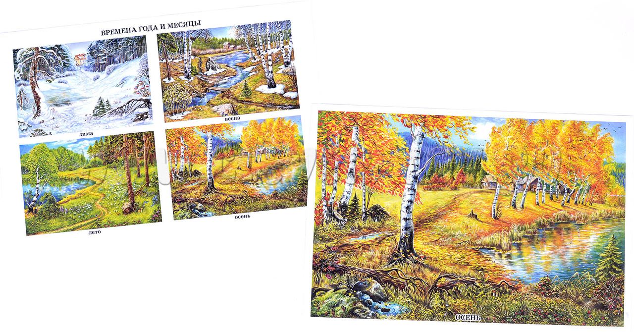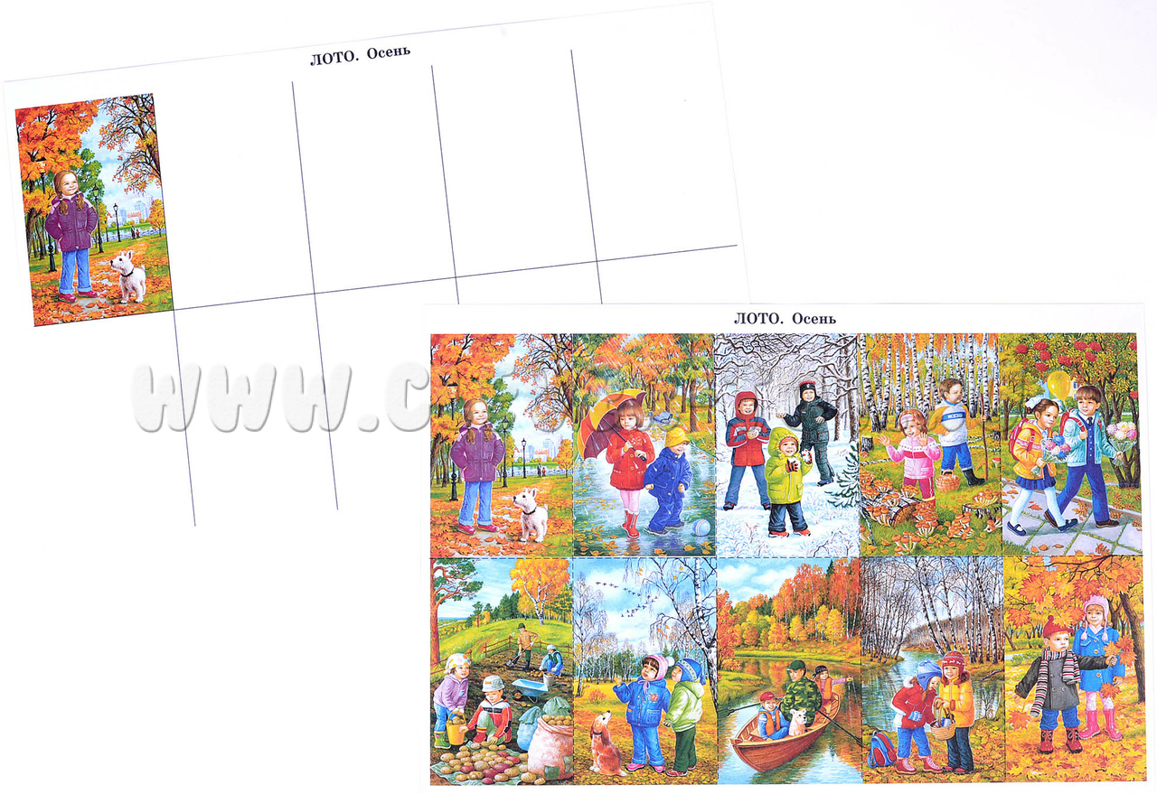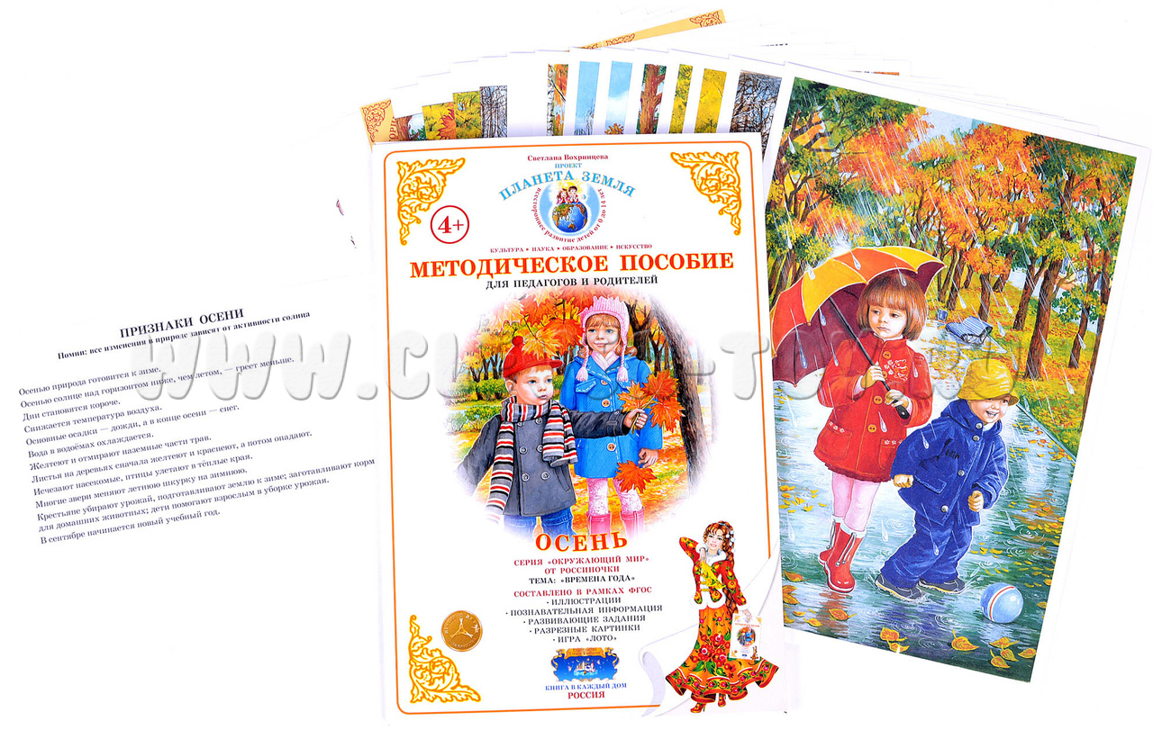 • 10 красочных изображений, иллюстрирующих изменение погоды, явления природы, виды деятельности, на обороте - список признаков осени, пословицы и приметы, загадки, планы развивающих и подвижных игр;