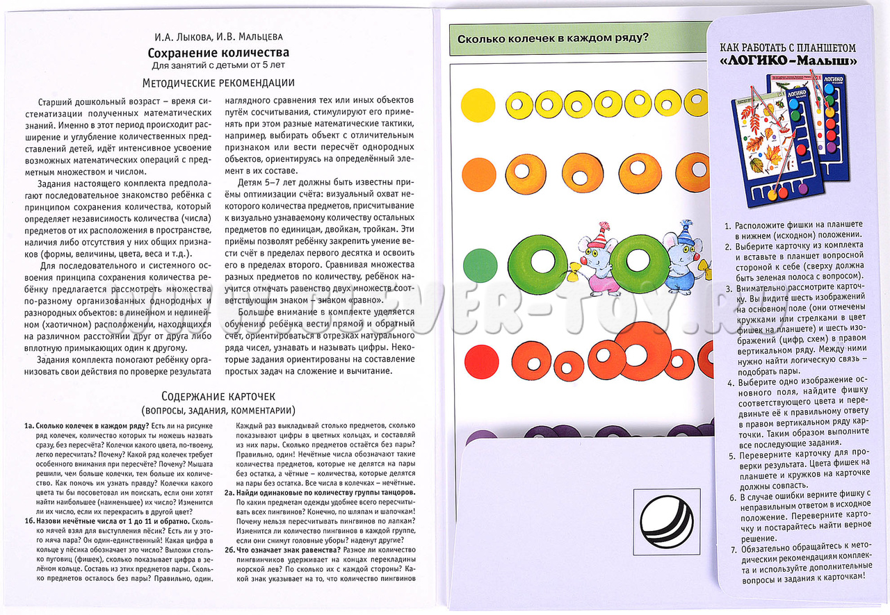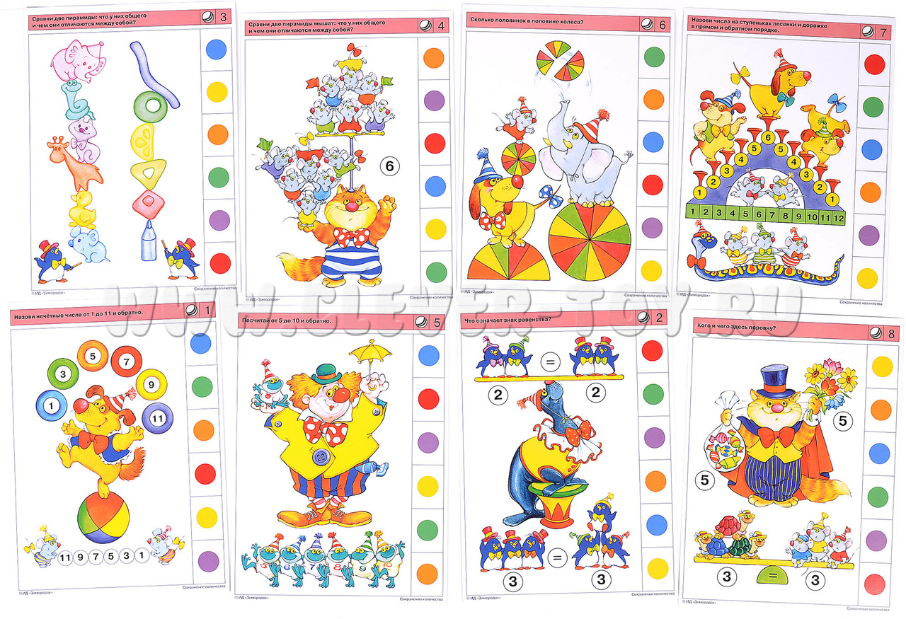 Задания настоящего комплекта предполагают последовательное знакомство ребёнка с принципом сохранения количества, который определяет независимость количества (числа) предметов от их расположения в пространстве, наличия либо отсутствия у них общих признаков (формы, величины, цвета, веса и т.д.). Ребёнок освоит приёмы оптимизации счёта: визуальный охват некоторого количества предметов; присчитывание к визуально узнаваемому количеству остальных предметов по единицам, двойкам, тройкам. Также уделяется внимание обучению вести прямой и обратный счёт, ориентироваться в отрезках натурального ряда чисел, узнавать и называть цифры. Примеры заданий в карточках: 2а. Найди одинаковые по количеству группы танцоров. 4б. Сравни две пирамиды мышат: что у них общего и чем они отличаются между собой? 5а. Клоун растерял вещи. Сколько каких? 7б. Назови числа на ступеньках лесенки и дорожке в прямом и обратном порядке. 8а. Сколько предметов появилось из шляпы в каждом облачке?