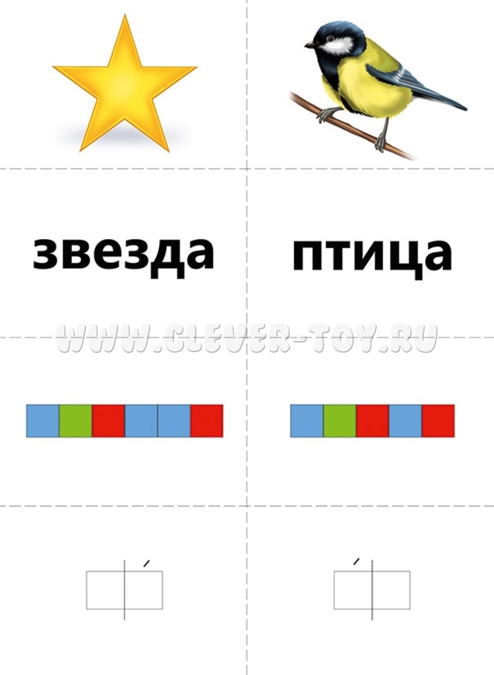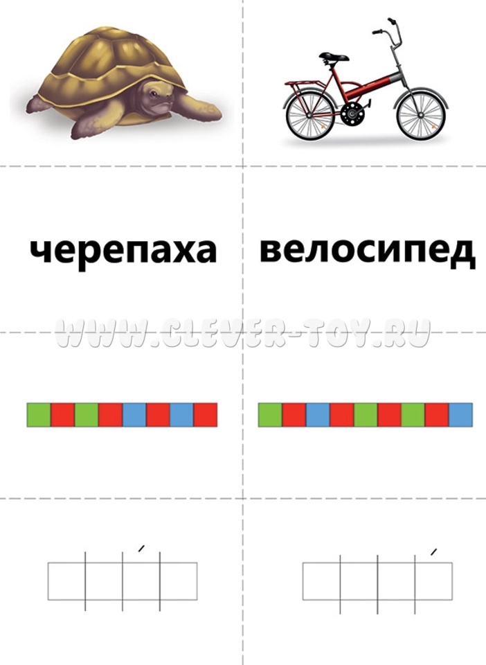 1. Это игра для индивидуальных и/или групповых занятий. Цель игры: подобрать слово и две схемы (звуковую и слоговую) к каждой из картинок. Если участвует группа детей, карточки с картинками (картинки можно заменить на слова) раздаются игрокам поровну, а ведущий начинает показывать поочередно карточки со словами (картинками) и схемами. Подходящие карточки участники забирают себе, побеждает тот, кто быстрее и правильнее всех соберет свои карточки;