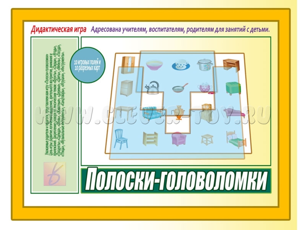 В наборе папка для хранения и 20 карт: 10 игровых полей и 10 разрезных карт с полосками разных форм. Перед началом игры полоски необходимо аккуратно вырезать по контуру.