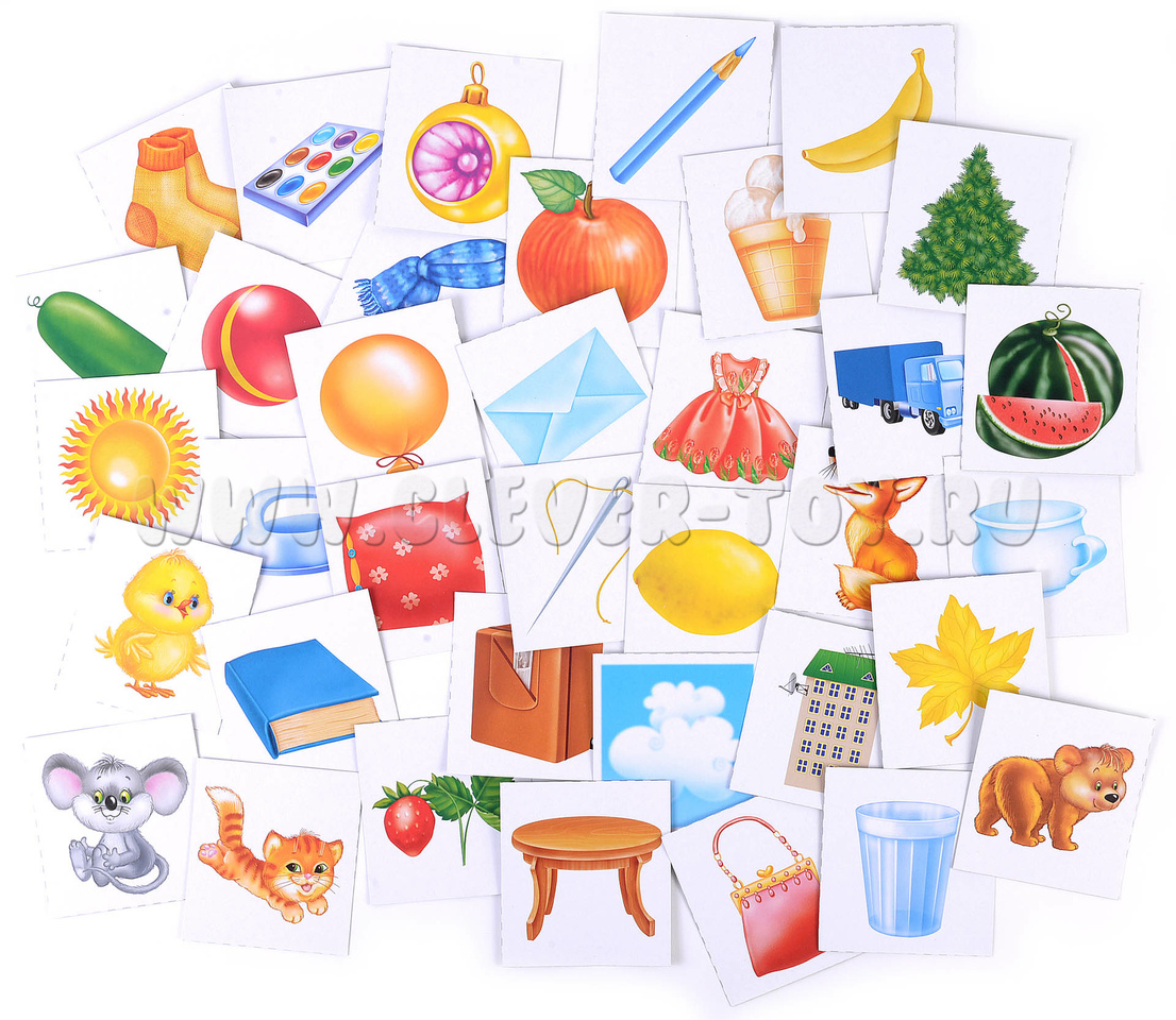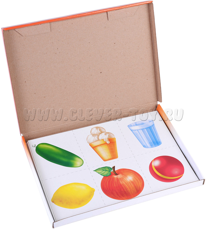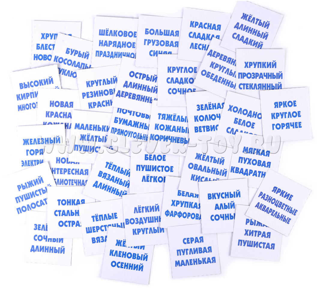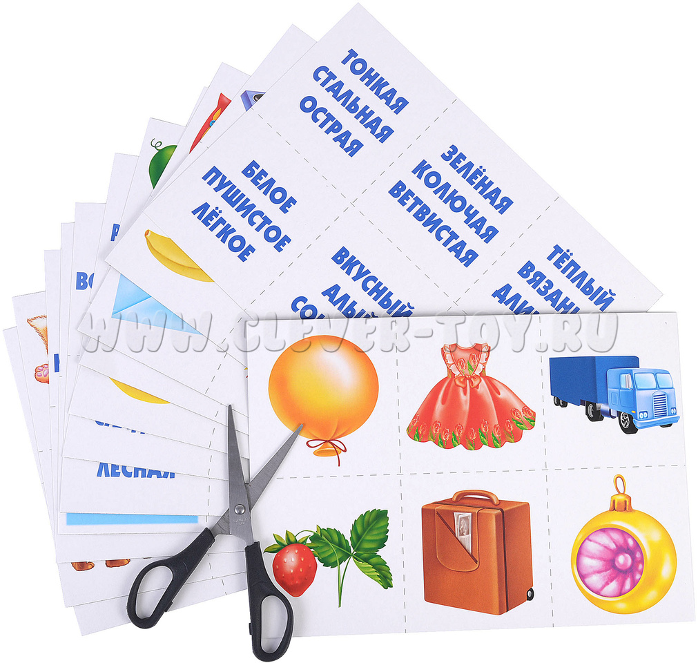Количество: 6 разрезных карт с картинками (по 6 на каждой, всего 36 карточек) и 6 разрезных карт со словами (каждая картинка описывается 3 словами, на большой карте по 6 троек свойств, всего 36 карточек)