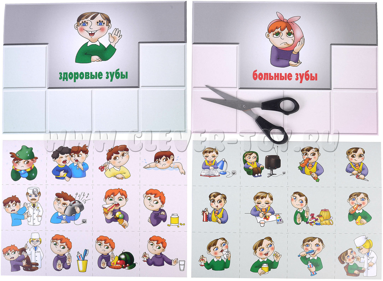 Количество: 12 больших карт (игровых полей), 6 разрезных карт с примерами хорошего и плохого отношения к здоровью (по 12 на каждой, всего 72 примера)