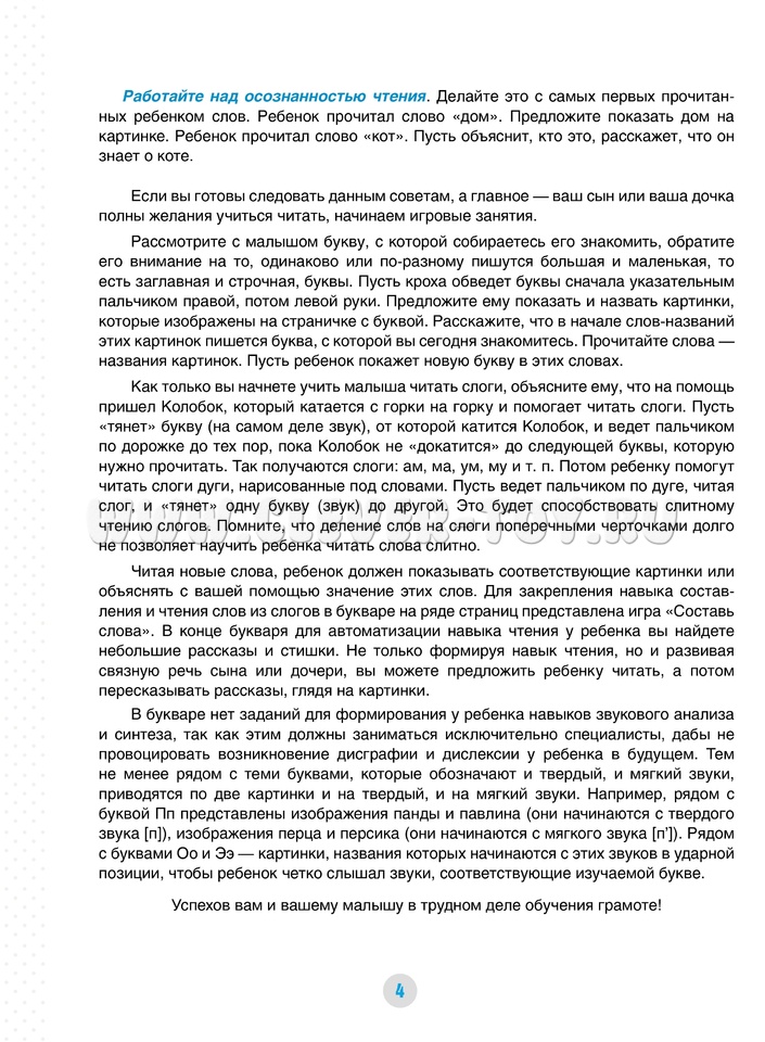 Расположение букв в букваре соответствует порядку появления звуков в речи ребёнка, что позволяет начать обучение чтению уже в четыре года, когда дети ещё не произносят сложные звуки русского языка. Этот букварь помогает легко развить у ребёнка навыки осознанного чтения и предотвратить проблемы с письменной речью (дисграфию и дислексию) в будущем.
