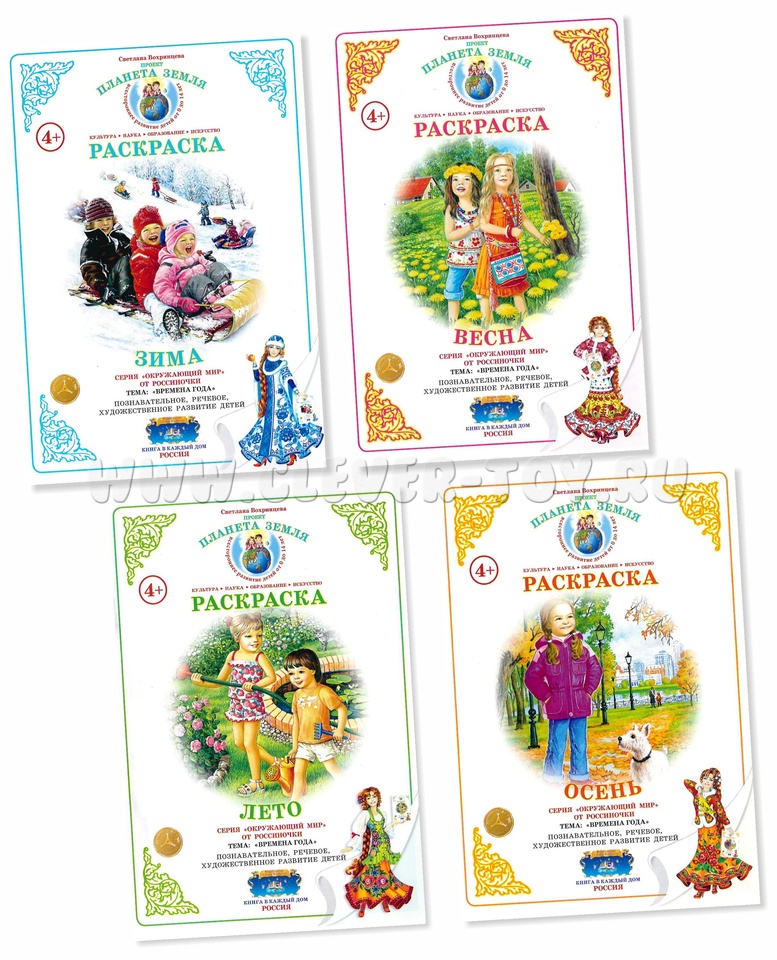 Набор из 4 раскрасок "Времена года" предназначена для детей от 4 лет. Внутри яркие иллюстрации на тему деятельности людей в течение года и предлагает 36 листов с контурами для раскрашивания. Эта раскраска помогает детям формировать и расширять представления о временах года, развивать познавательные интересы, творческие способности и навыки устной речи.