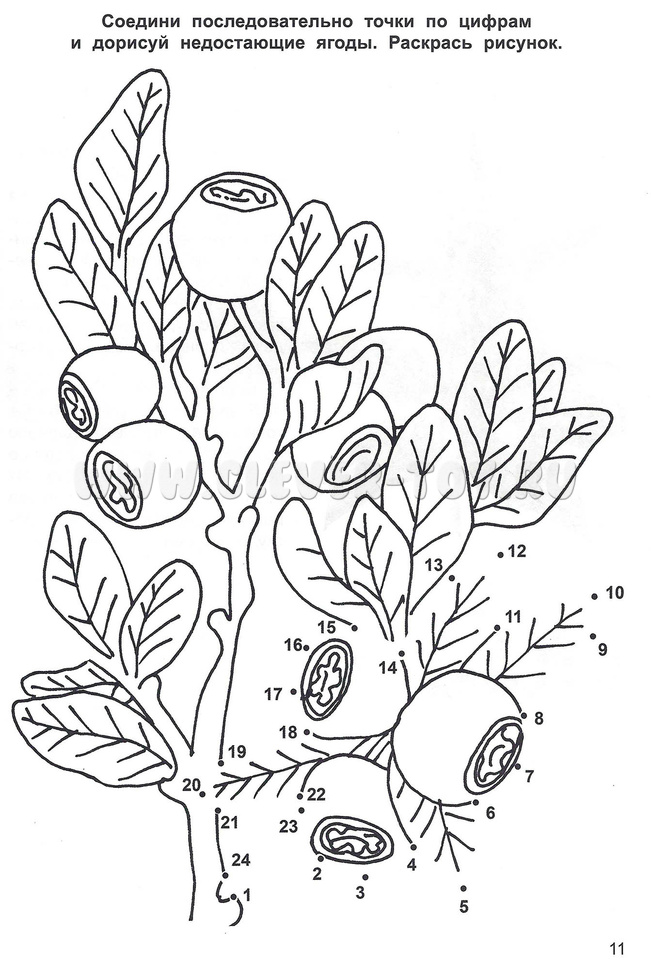 - Творческие задания (Соедини линиями точки и раскрась рисунок; Раскрась картинку; Соедини последовательно точки по цифрам и дорисуй недостающие ягоды).