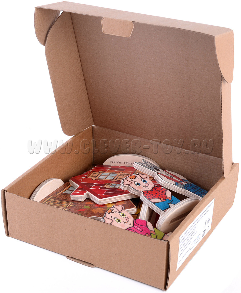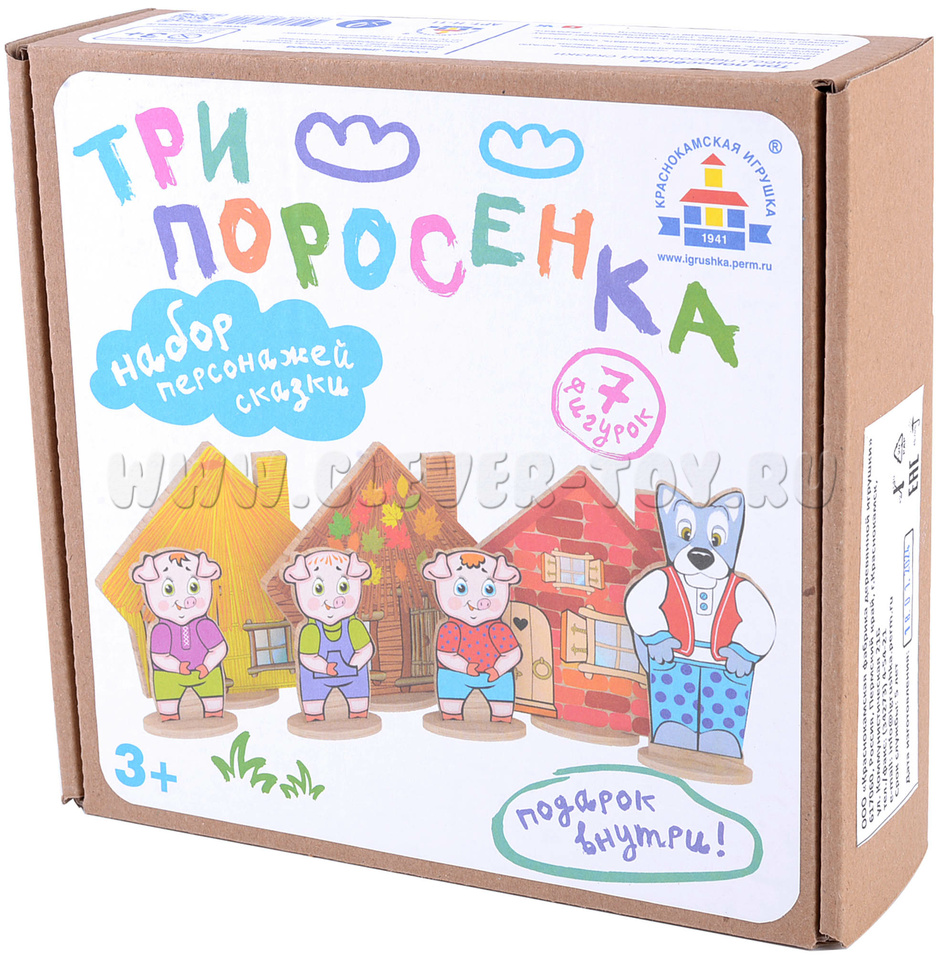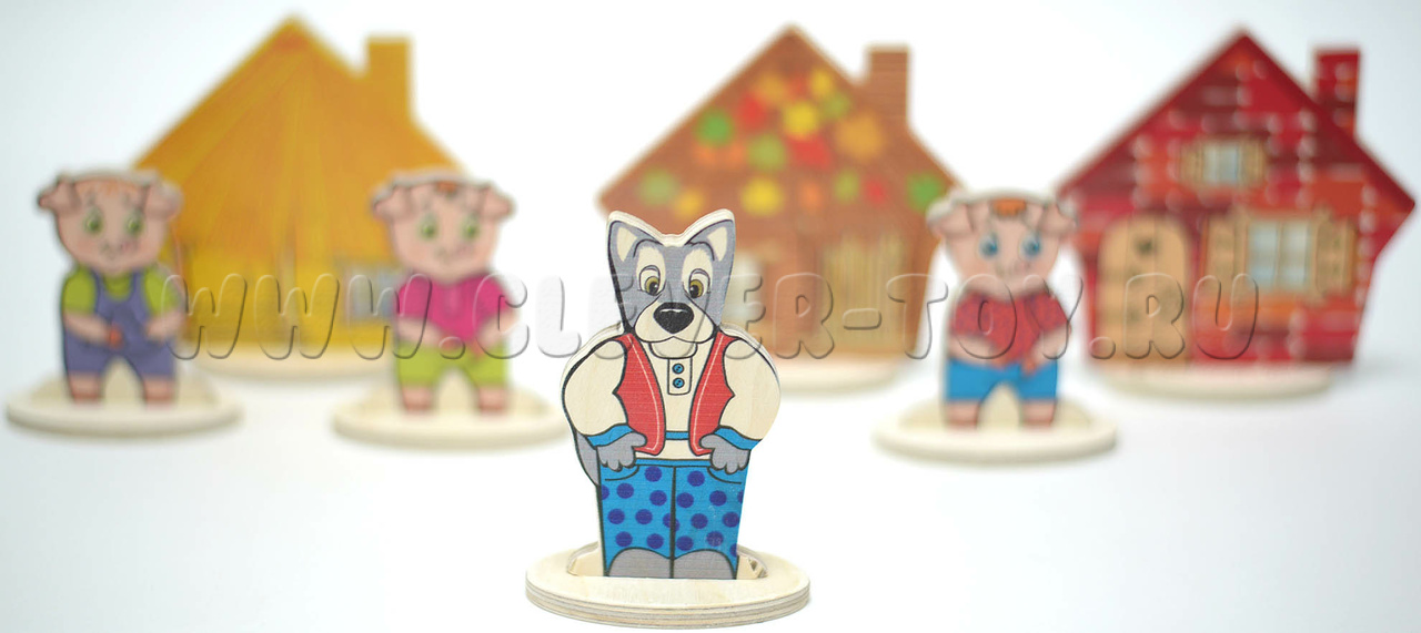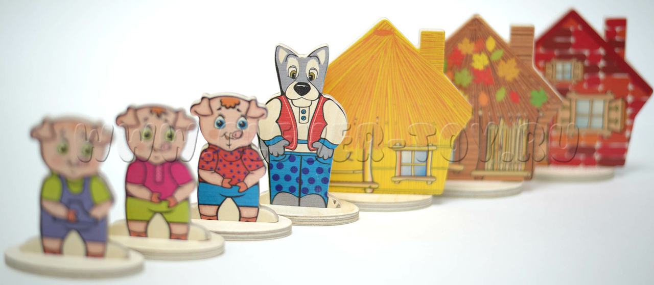 • 7 деревянных фигурок на подставках (3 поросенка, 3 избушки, волк)