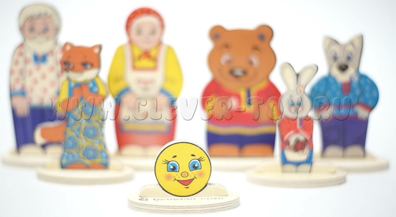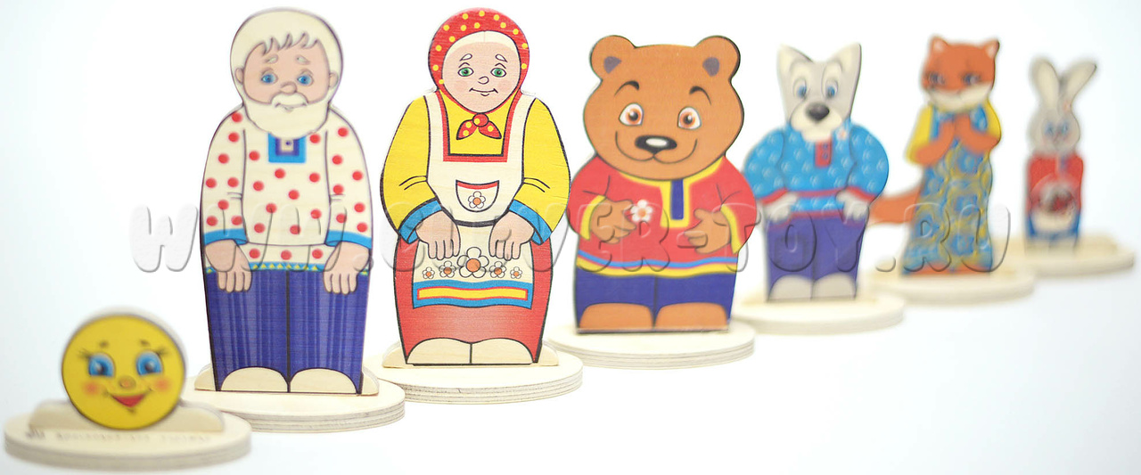 • 7 деревянных фигурок на подставках (Колобок, Дед, Бабка, заяц, медведь, волк, лиса) размером от 4 до 12 см.
