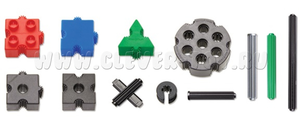 В комплект входят 430 разноцветных деталей 12 разных форм и размеров, включая колеса, соединительные элементы, фиксаторы, что позволяет создавать множество различных, в том числе подвижных моделей, использующих в конструкции рычаги.