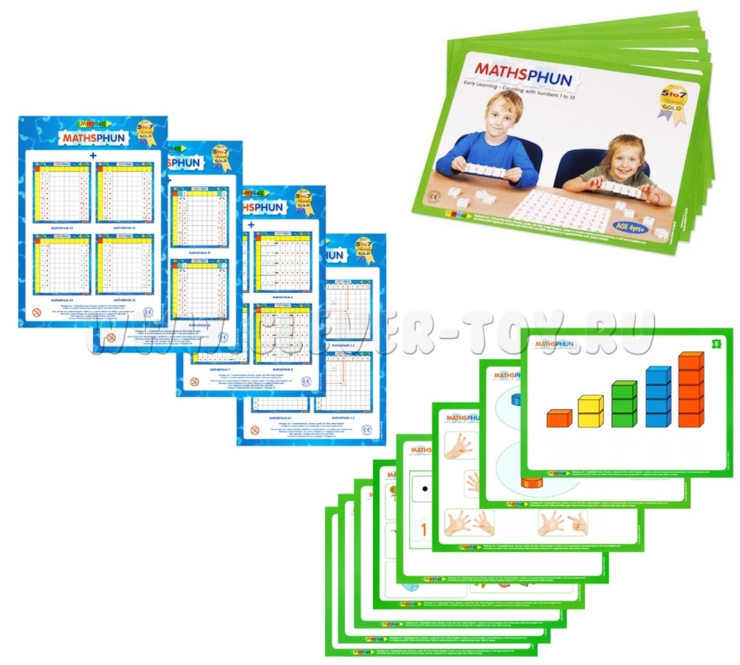 1. 4 красочные двухсторонние карточки формата А4, на которых нанесены по четыре задания на сложение (задания подобраны от простого к сложному).