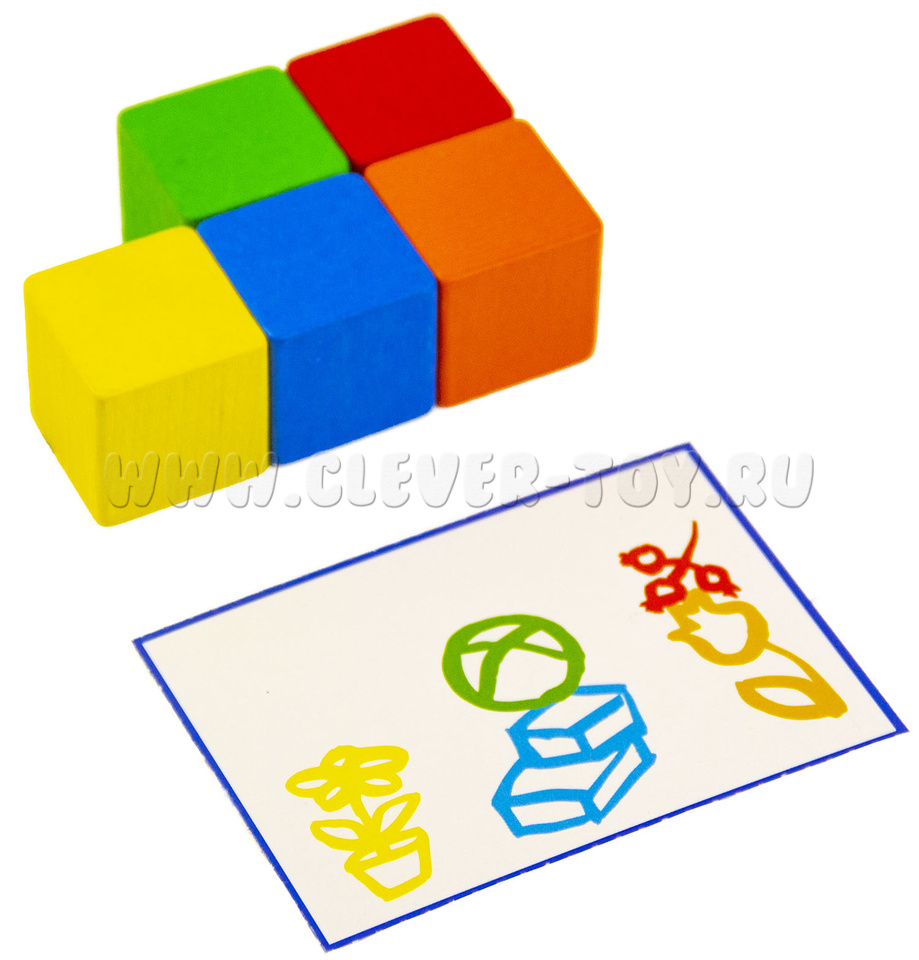 Правила. Игроки расставляют кубики по соответствующим цветам элементов на карточке с заданием. Кто первым это сделает - забирает картинку. Победителем окажется обладатель наибольшего количества карточек.