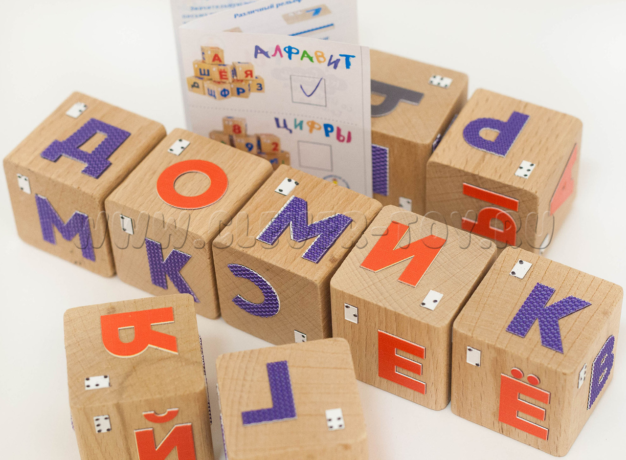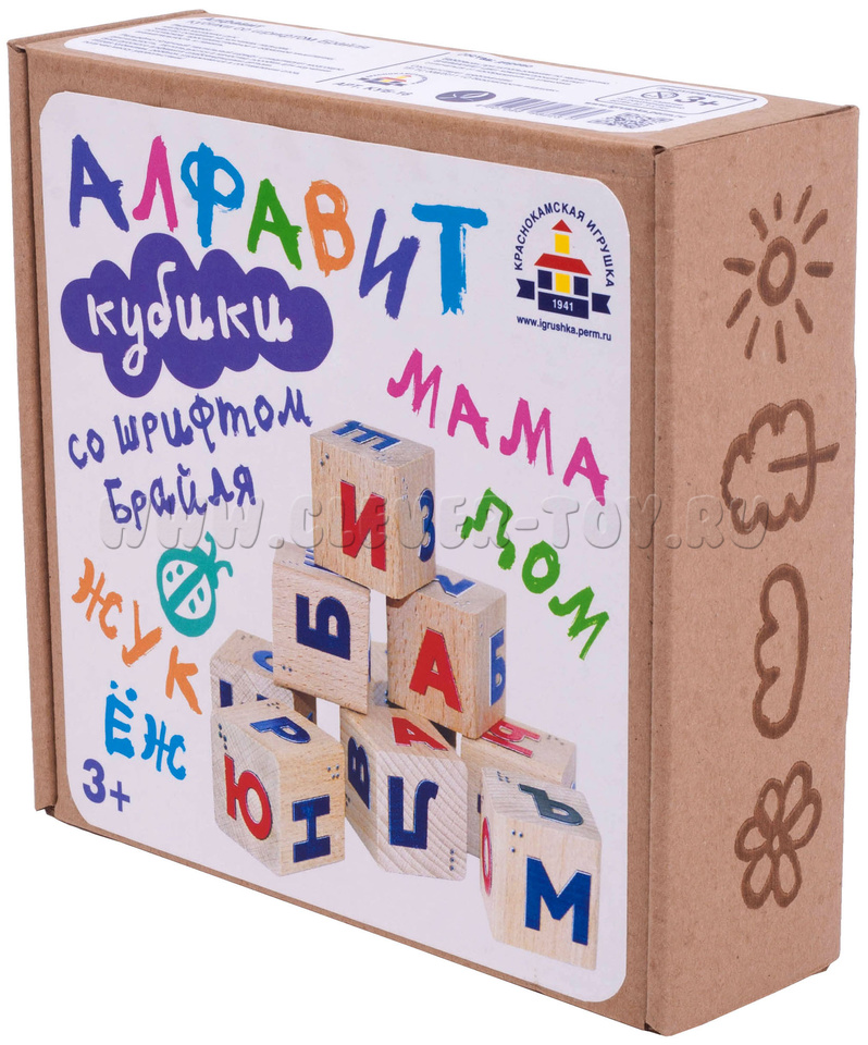 Натуральные, экологически чистые, безопасные и долговечные деревянные кубики со шрифтом Брайля от Краснокамской фабрики деревянной игрушки – производителя развивающих игрушек с 1941 года.