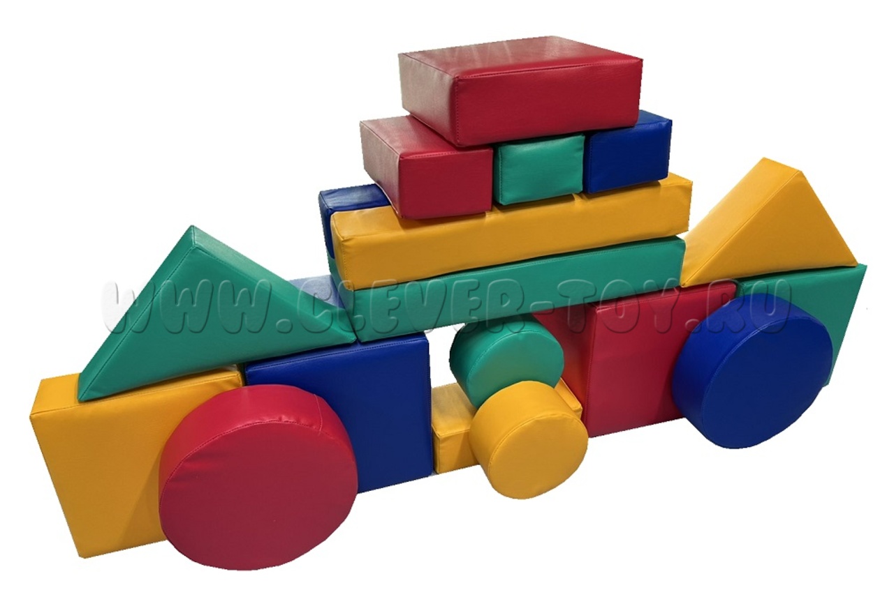 Комплектация: куб 30*30*30 - 2 шт. прямоугольник 60*30*10 - 1шт. круг D30*H10 - 2шт. круг D20*H10 - 2шт. прямоугольник 30*15*10 - 4шт. треугольник 30*30*10 - 2шт. квадрат 30*30*10 - 3шт. брус 60*10*10 - 2шт.