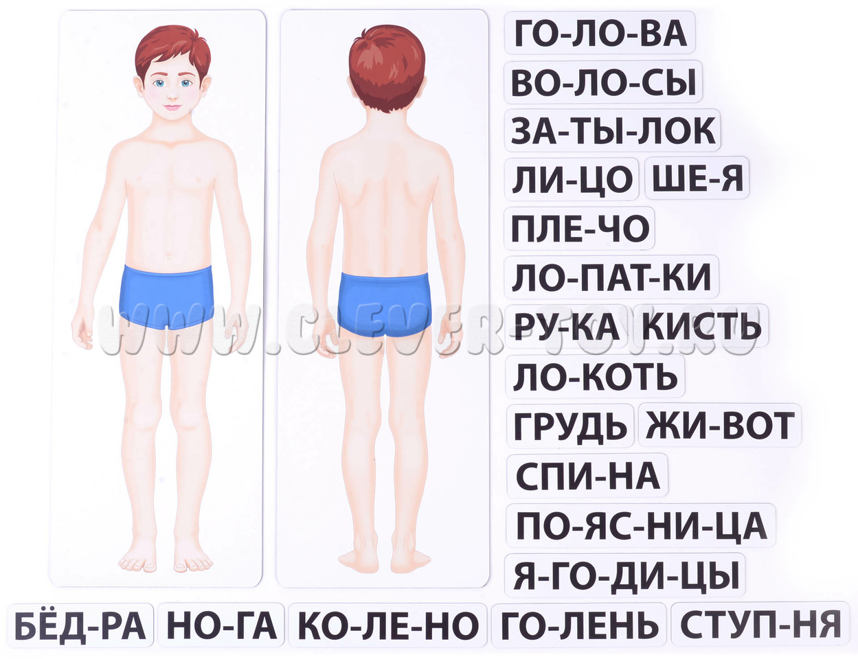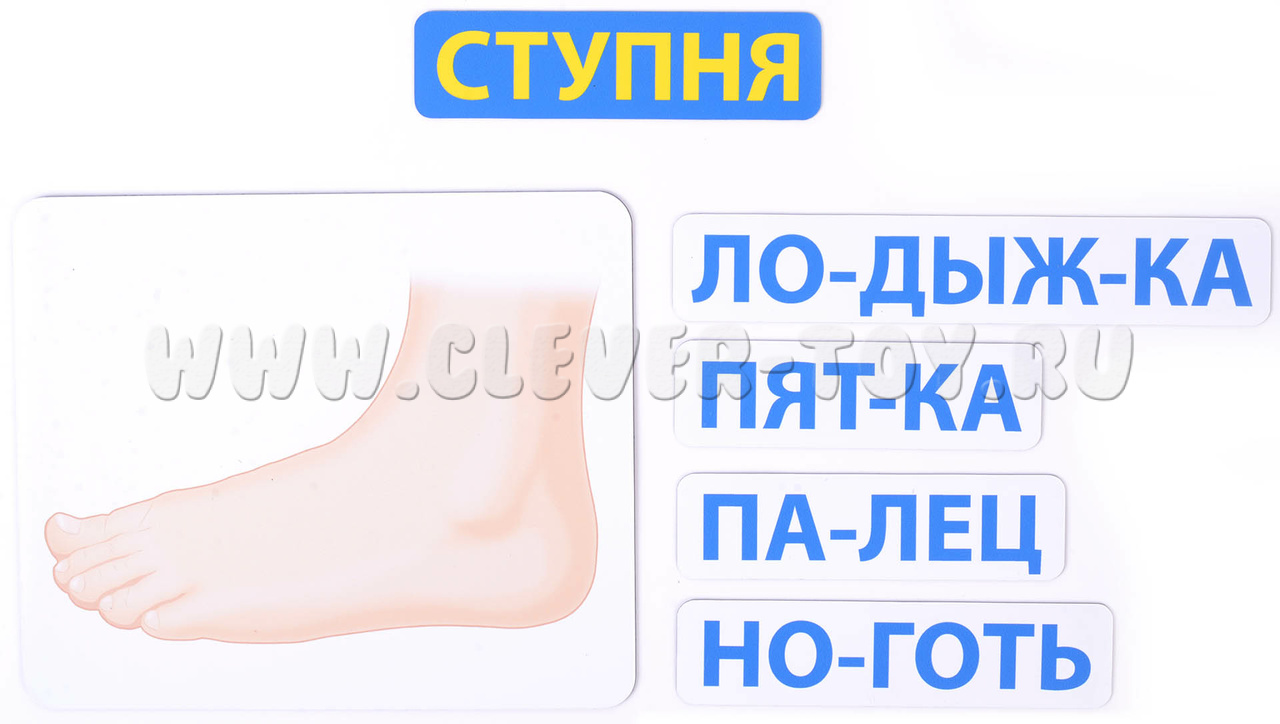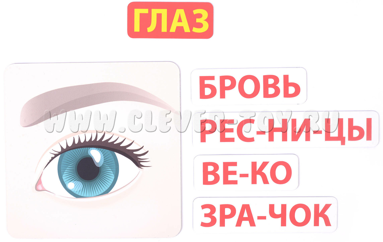 В наборе 88 магнитных карточек трёх видов: плакаты с изображением тела или его частей (сами служат магнитной основой); названия, разбитые по слогам; внутренние органы (знакомим с ними постепенно, по возрасту).
