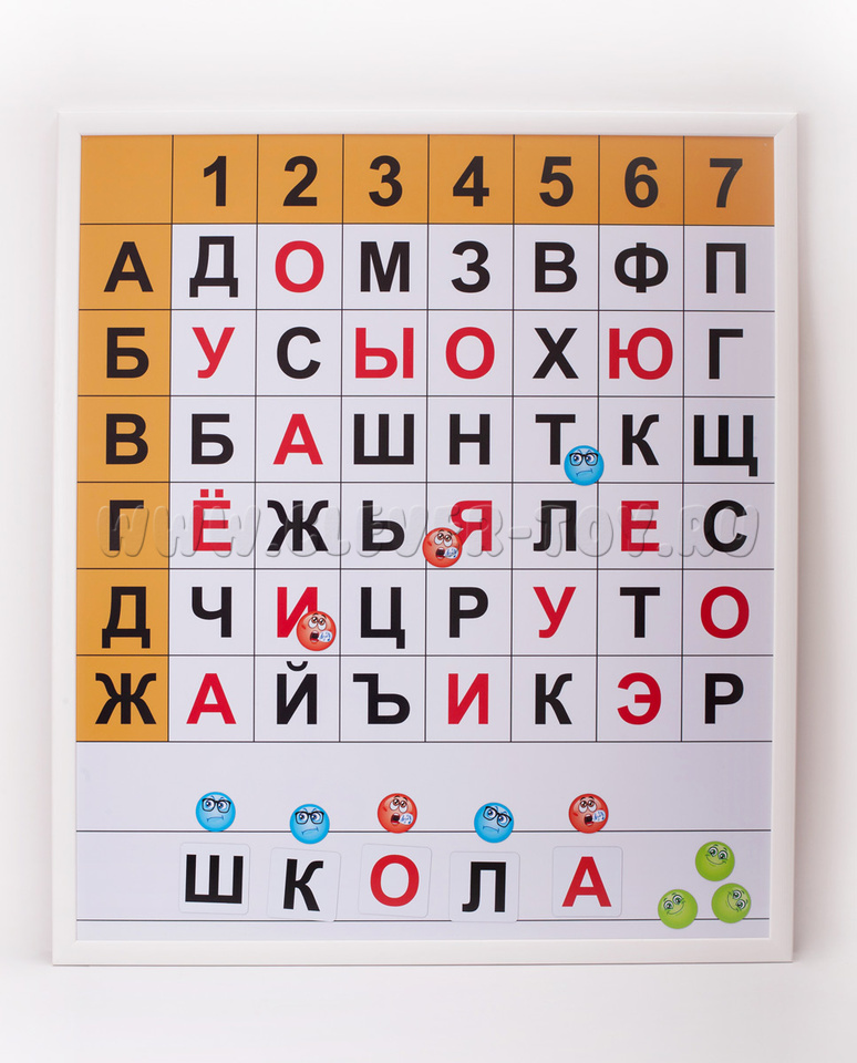 В комплекте с доской поставляются 71 карточка с буквами, чтобы составлять слова и делать их звуковой анализ и одна пустая карточка, на которой, например, можно написать любую букву. А также специальные разноцветные смайлики, которые помогают превратить фонетический разбор даже самого сложного слова в увлекательную игру - по 10 штук красного, синего и зелёного цвета.